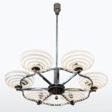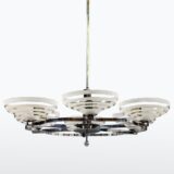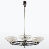 Lustr z období Art Deco, s typickými pískovanými skleněnými stínidly s kruhovým dekorem. Chromovaná konstrukce podtrhuje technicistní charakter 30. let a dodává svítidlu jasně dobový výraz.
