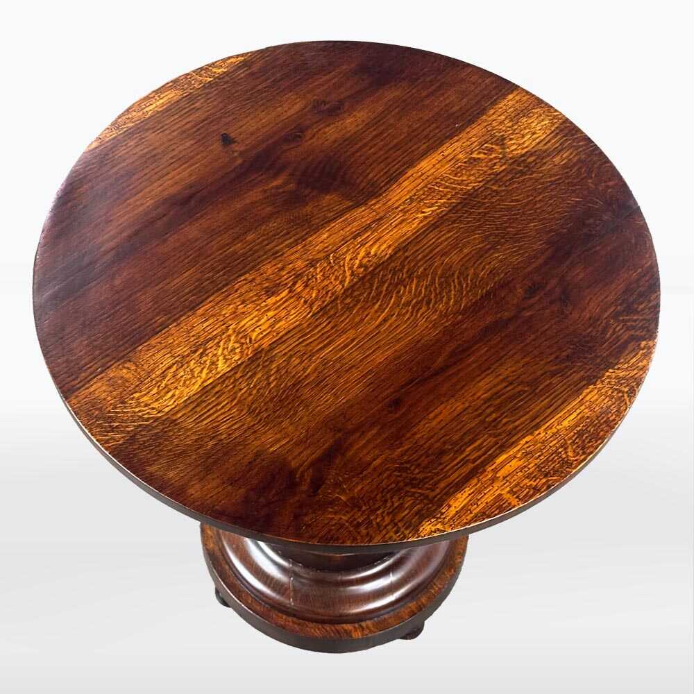 Kulatý stolek ve stylu Art Deco z 30. let, který zaujme svou čistou geometrií a nádherně kreslenou dýhou v teplých ořechových tónech. Konstrukce na třech rovných nohách nechává vyniknout bohatý dekor dřeva, zatímco horní tvrzená skleněná deska dodává celku vzdušnost a lehkost.