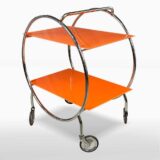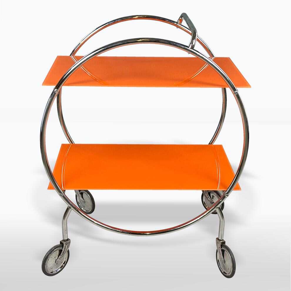 Chromová konstrukce je v původním stavu – pouze vyčištěno a vyleštěno. Znatelné stáří. Desky stolku jsou odborně restaurovány polyuretanovým lakem.