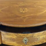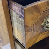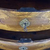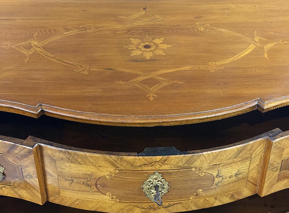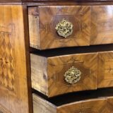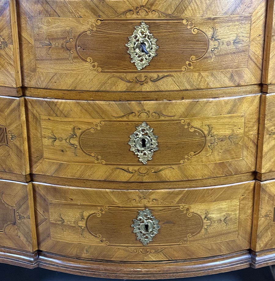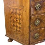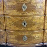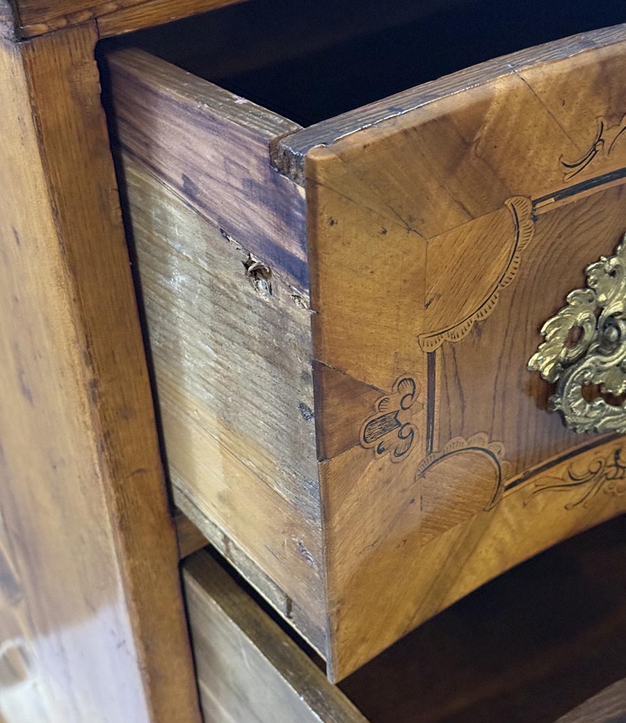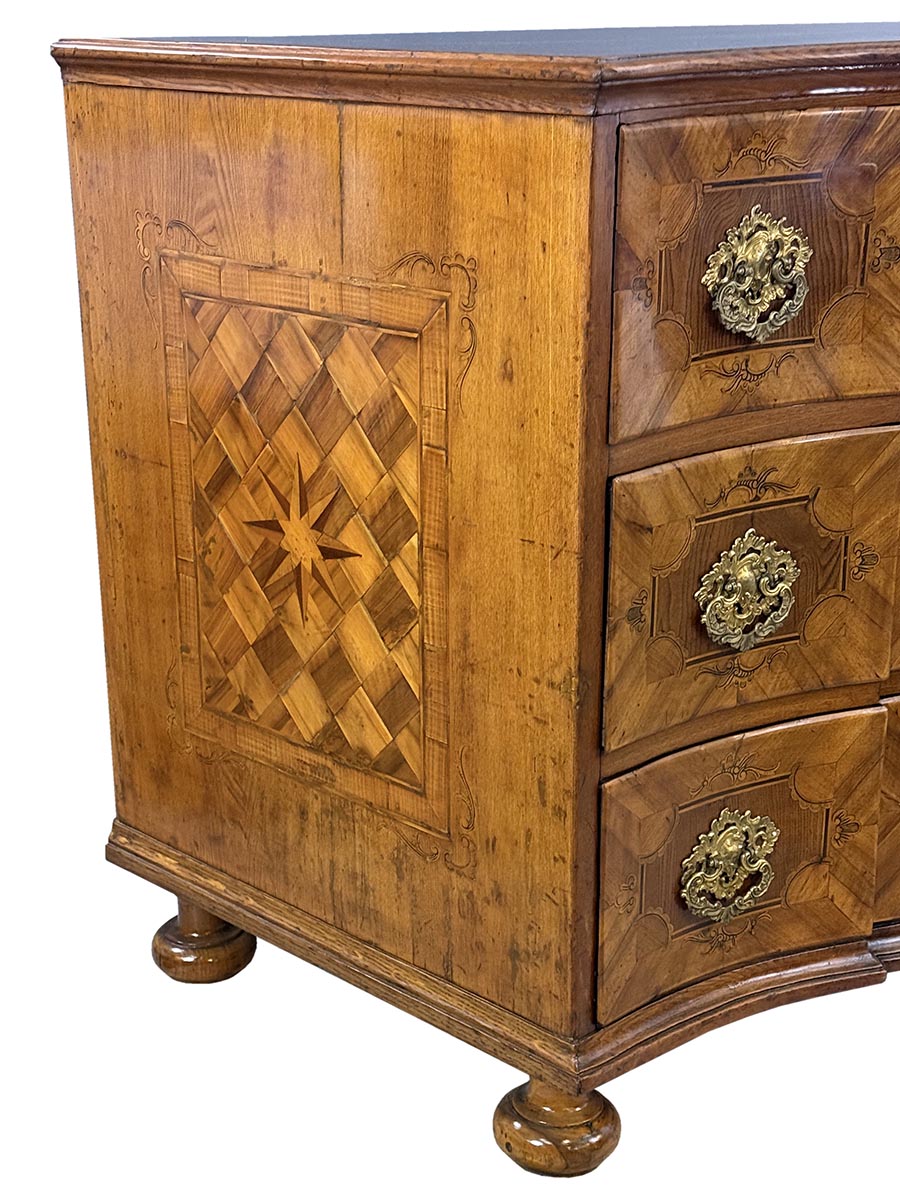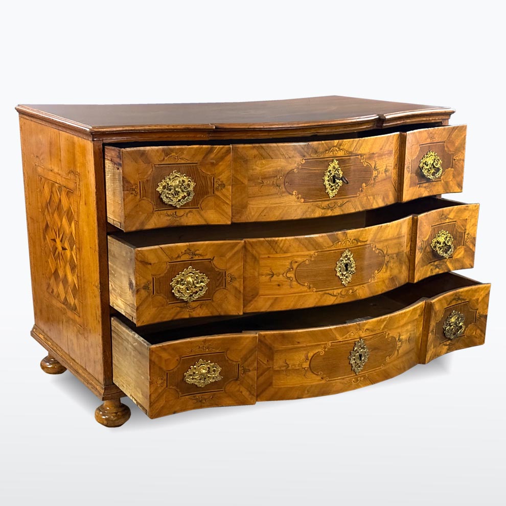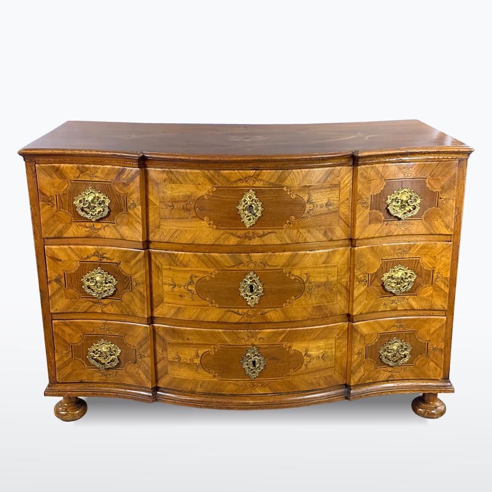 Tato barokní komoda s typickým esovitě prohnutým čelem je ukázkou vysoce kvalitního truhlářského a intarzačního řemesla. Čelní zásuvky i horní deska nesou precizní intarzii z různých dřevin, doplněnou o výraznou kresbu ořechové dýhy.