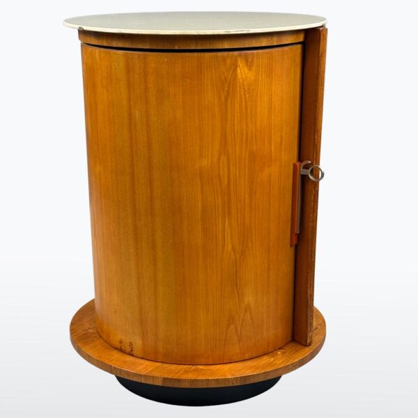 Válcový barový stolek, který vznikl v UP Závodech (Spojené uměleckoprůmyslové závody) pravděpodobně v průběhu 50. let 20. století. Typická madla a kroužek na dvířkách jsou rukopis UP Závodů a dodávají kusu jemný funkční detail. Tento kousek je skvělou ukázkou poválečného československého designu, který klade důraz na funkční detaily a nadčasovou formu.