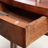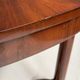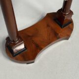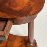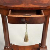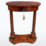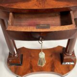 Konzolový stolek z období biedermeieru s typickou jednoduchou linií. Horní deska v oválném tvaru je doplněna šuplíkem se zámkem, který je decentně zapracován do celku. Dvojice sloupových noh spočívá na podstavci s jemně tvarovanou základnou. Povrch je dýhován kvalitním ořechem s krásnou kresbou, kontrastně doplněným černě mořenými detaily v podnoží. Zámek plně funkční, včetně klíče.