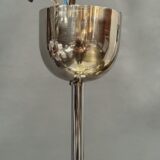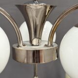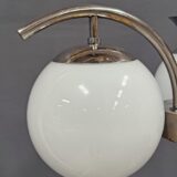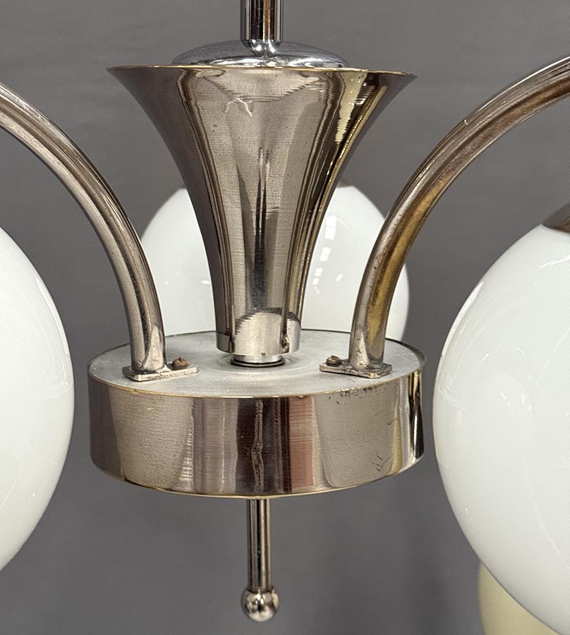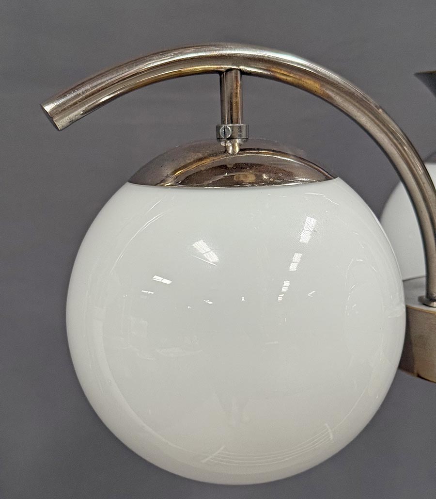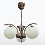 Tříramenný lustr ve stylu Art Deco z 30. let, který zaujme čistou siluetou a nadčasovou kombinací chromovaného kovu a opálových skleněných koulí. Jemně tvarovaná centrální část a elegantní křivky ramen podtrhují typický funkcionalistický výraz období, zatímco kulové stínidla dodávají světlu měkký, rovnoměrný rozptyl.