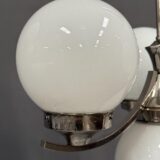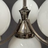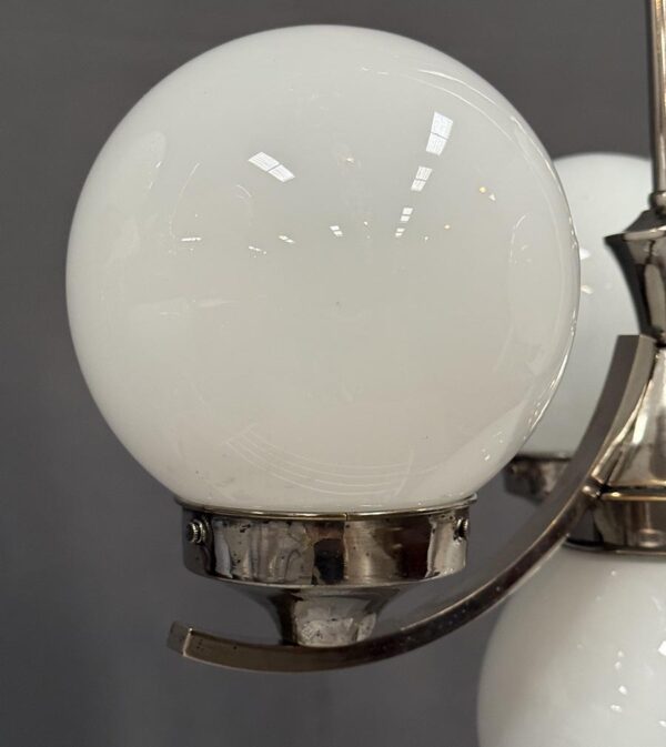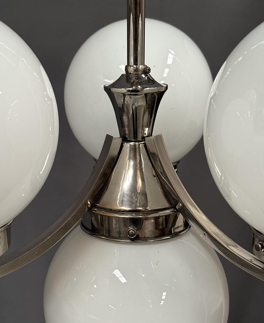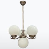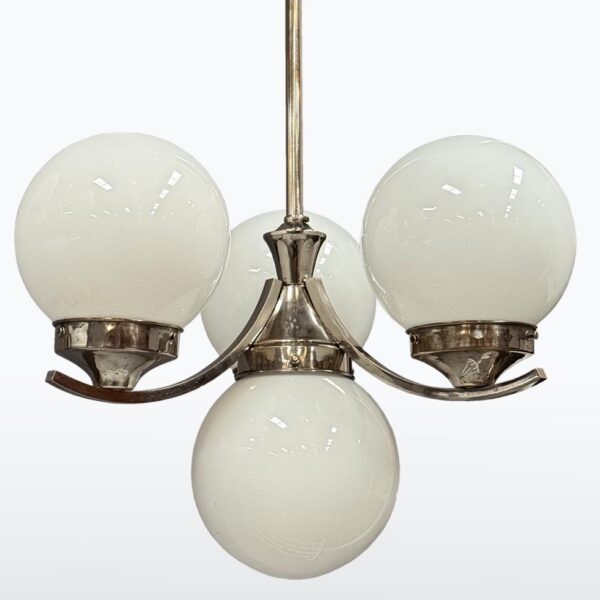Chromový lustr z období Art Deco, osazený čtyřmi opálovými skleněnými stínidly. Čisté linie a jednoduchá geometrie odrážejí dobový vkus 30. let a tvoří nadčasový doplněk pro interiér. Chromovaná konstrukce s decentně prohnutými rameny působí reprezentativně a přitom subtilně. Lustr je plně funkční ( nová elektroinstalace) a připravený k okamžité instalaci.