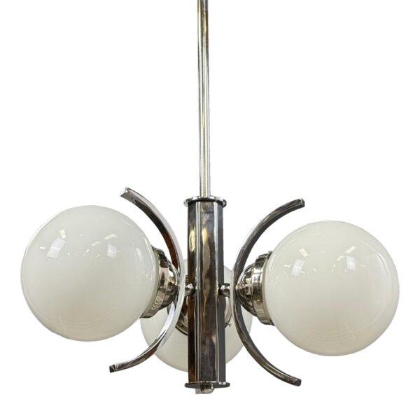 Tříramenný lustr ve stylu Art Deco z 30. let 20. století. Chromovaná konstrukce s centrální kulovitou částí a třemi symetricky rozmístěnými rameny nese opálová skleněná stínidla.