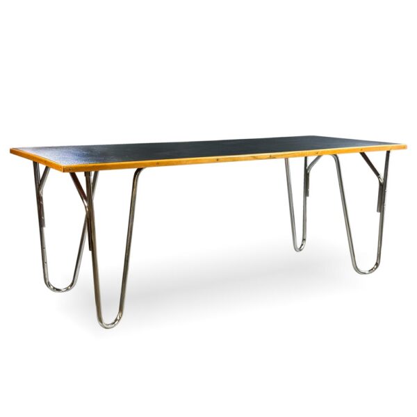 Funkcionalistický pracovní stůl ve stylu Bauhaus, pravděpodobně vyrobený firmou Thonet pro společnost Baťa. Charakteristická chromovaná trubková konstrukce a minimalistická forma odpovídají meziválečné průmyslové estetice. Chrom byl odborně vyčištěn a vyleštěn. Deska je nyní opatřena černou koženkou (původně marmoleum).