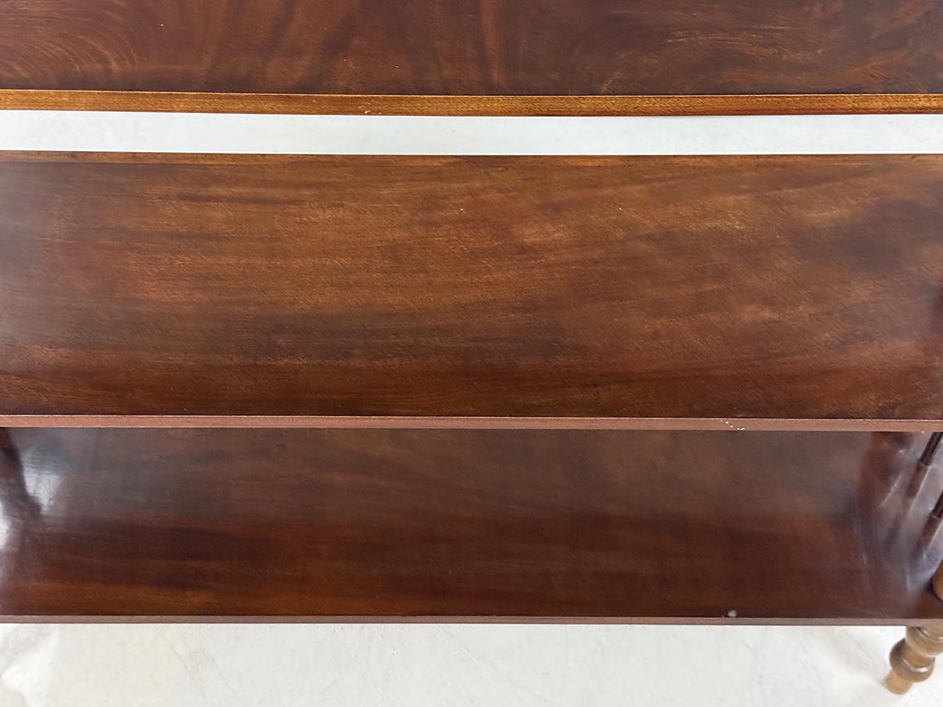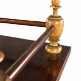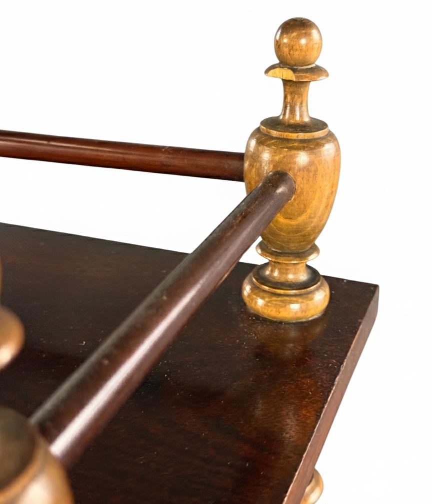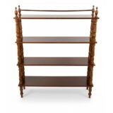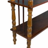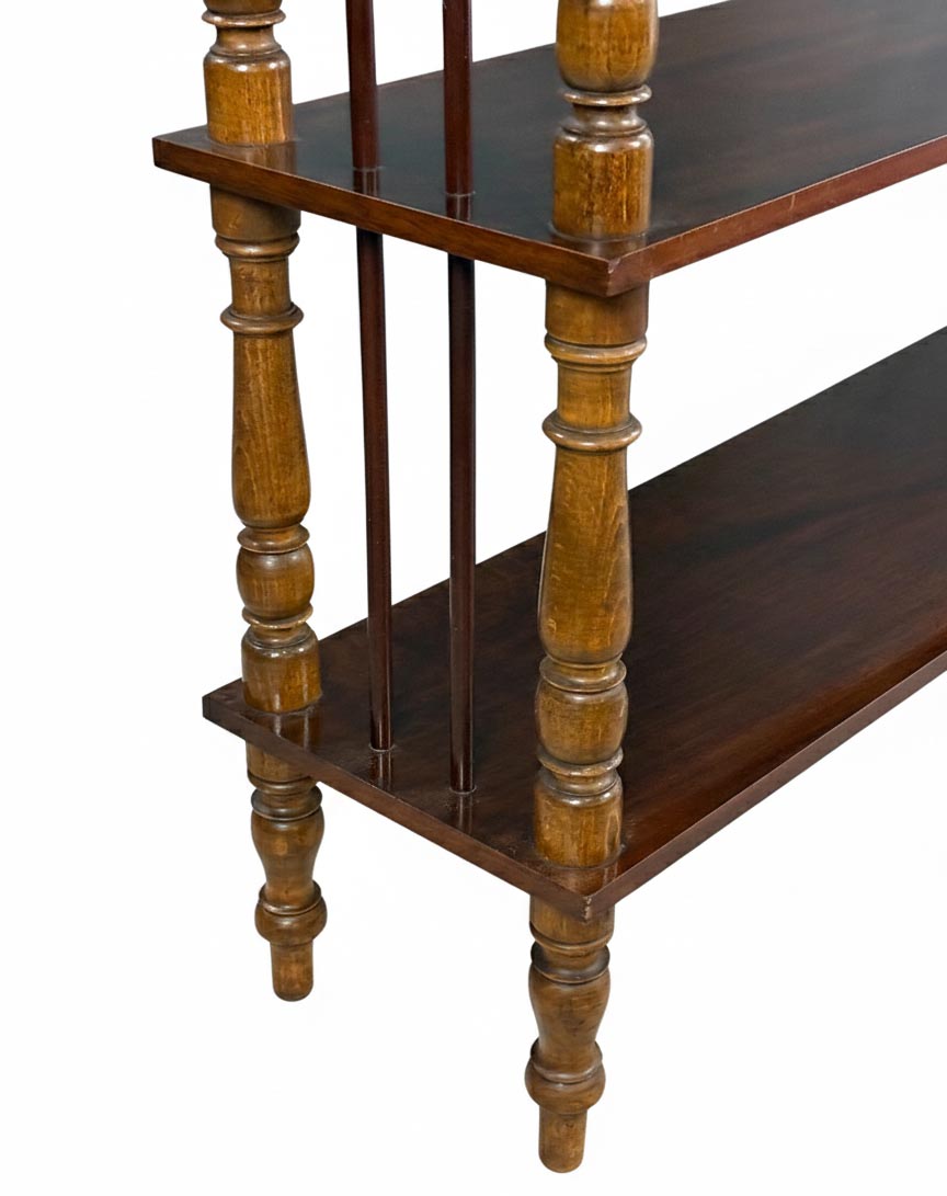 Historický etažér z masivního dřeva s jemně soustruženými sloupky a decentním horním zábradlím. Celek působí lehce a vyváženě, s krásnou přirozenou patinou, která podtrhuje jeho autentický charakter. Dochován v původním nálezovém stavu; dle stop je pravděpodobné, že byl v minulosti odborně restaurován.