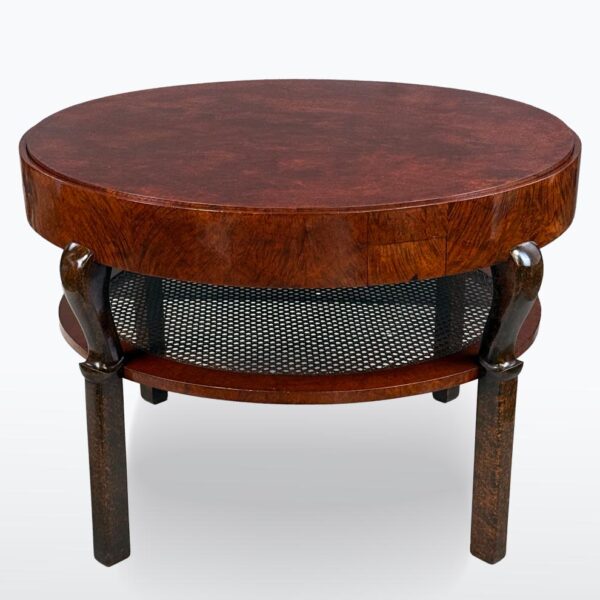 Kulatý karetní stolek z období Art Deco, datovaný do 30. let 20. století. Masivní konstrukce v kombinaci s krásnou ořechovou dýhou dodává stolku výrazný charakter. Horní deska je překlápěcí — z jedné strany ušlechtilá dýha pro běžné použití, z druhé originální zelený plstěný povrch určený ke karetním hrám, který je původní a nese známky používání.