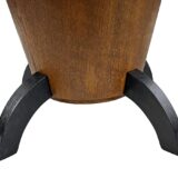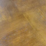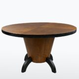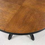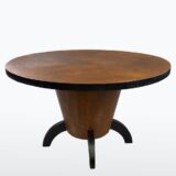 Tento konferenční stůl z 30. let je nadčasovou ukázkou střídmého Art Deca. Robustní dubová konstrukce a dýhovaná kulatá deska s přiznanou patinou nesou původní moření i hranu v tmavším tónu. Stůl působí architektonicky a symetricky.