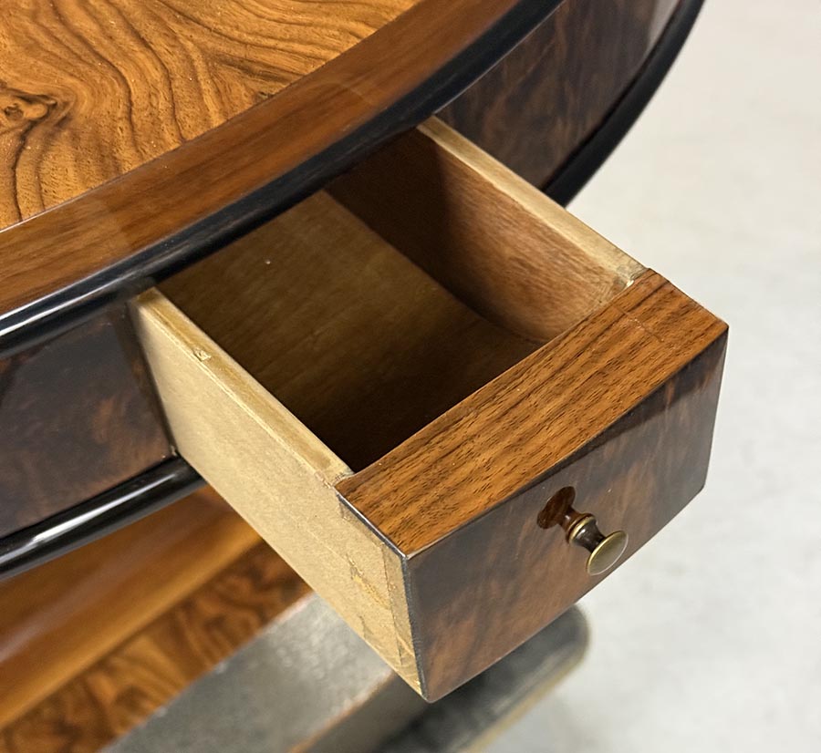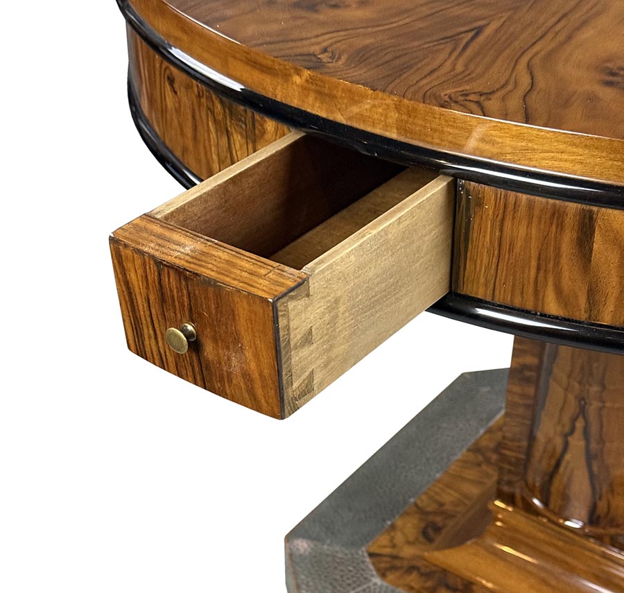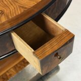 Luxusní kulatý hrací stolek ve stylu Art Deco zaujme nejen svou výraznou kresbou ořechové dýhy, ale i promyšleným funkčním řešením. Stolová deska má nádhernou kresbu ořechové kořenice a vytváří působivý dekorativní efekt, typický pro kvalitní práci 30. let.