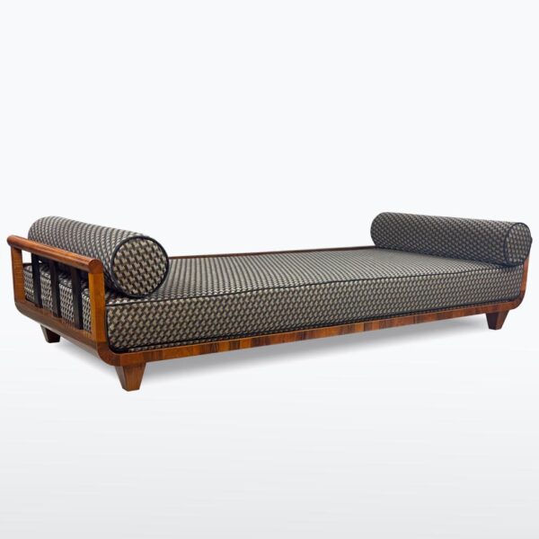 Lenoška nebo-li sofa je nově očalouněna kvalitní látkou s geometrickým vzorem, doplněna o dva válcové opěrné polštáře.