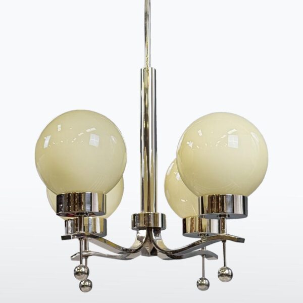 Čtyřramenný niklový lustr z období Art Deco, který vyniká perfektní symetrií, oblými liniemi a působivým původním designem. Kombinace kovu a jemně krémových opálových koulí vytváří ikonický vzhled 30. let, který dodá prostoru nadčasový styl a luxusní atmosféru.
