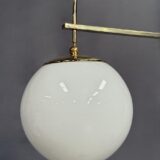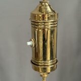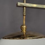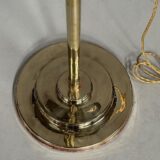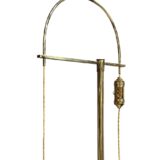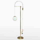 Mosazná stojací lampa z poloviny 20. století s oblým ramenem a původním opálovým skleněným stínidlem. Konstrukce je celá z leštěné mosazi, doplněná o závaží na kabelu, které slouží nejen jako vypínač, ale zároveň umožňuje výškové nastavení stínidla.