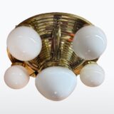 Tato secesní mosazná stropnice z počátku 20. století je výrazným dekorativním prvkem s typickými prvky rané moderny. Masivní mosazná základna je tvarována do jemně odstupňovaného profilu a nese šest opálových skleněných stínidel, které vytvářejí měkké, rovnoměrné světlo.