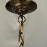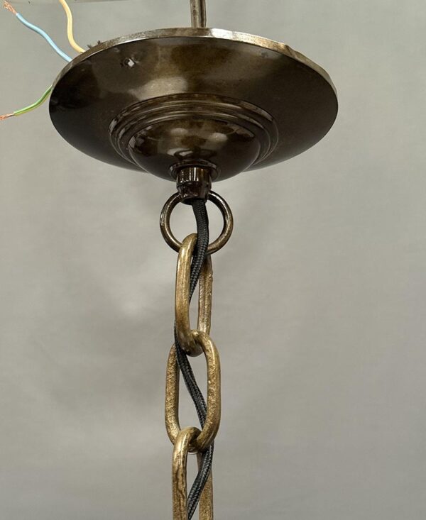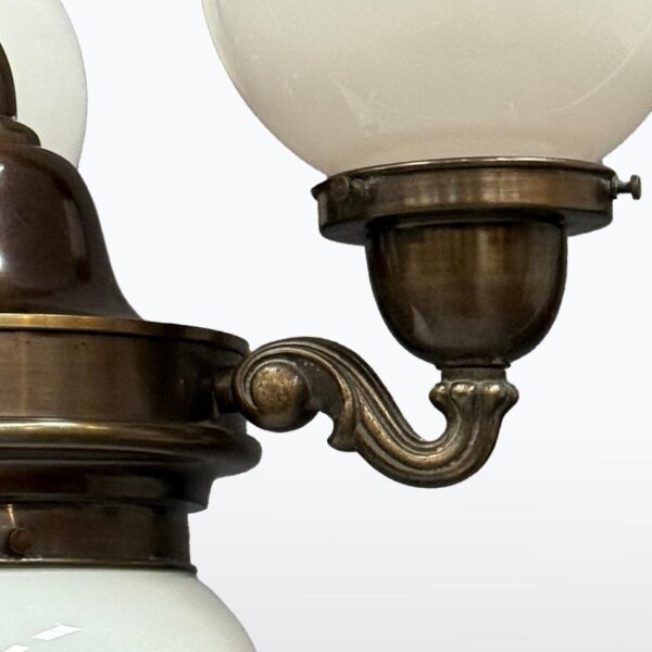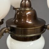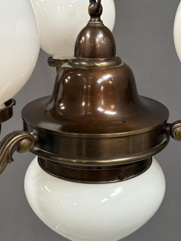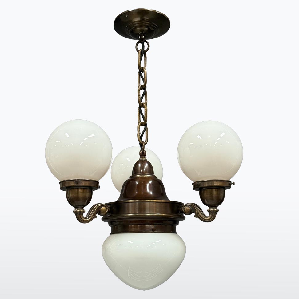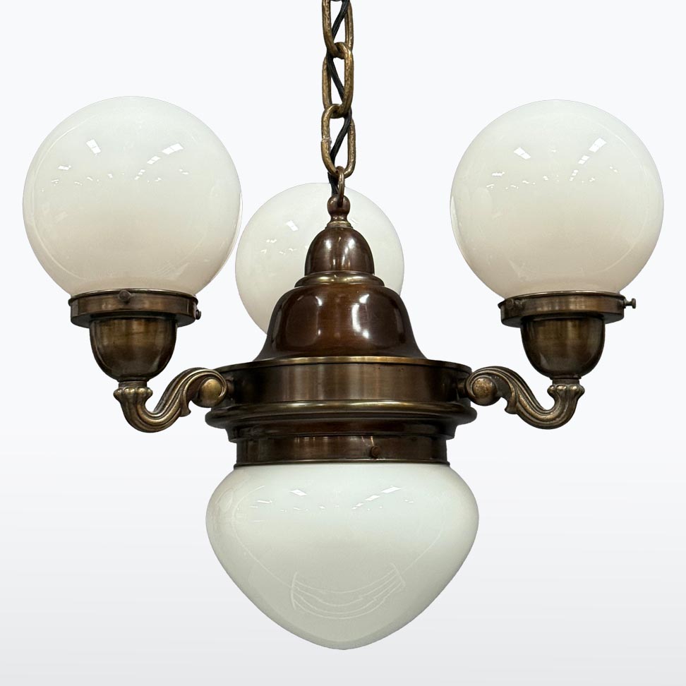 Mosazný lustr z 20. let 20. století, nesoucí čtyři opálová skleněná stínidla. Centrální tělo s decentním profilováním doplňují tři krátká ramena s jemně tvarovanými úchyty, které podtrhují symetrii a reprezentativní charakter. Masivní mosazná konstrukce v kombinaci s řetězovým zavěšením dodává svítidlu robustnost, zatímco opálové koule rozptylují měkké a příjemné světlo. Plně funkční – nová elektroinstalace.