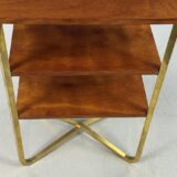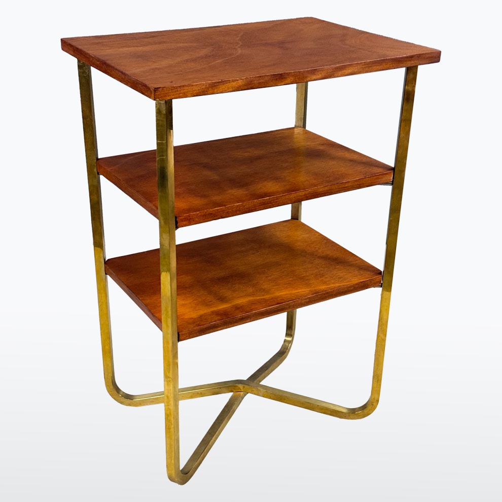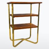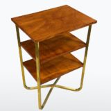 Tento stolek z 30. let kombinuje mosaznou konstrukci s dřevěnými policemi a přináší typickou lehkost funkcionalistického nábytku. Mosazný rám tvoří čisté  linie a zajímavě tvarovanou podnož, která dává stolku stabilitu i dekorativní výraz. Tři dřevěné plochy poskytují praktický odkládací prostor.