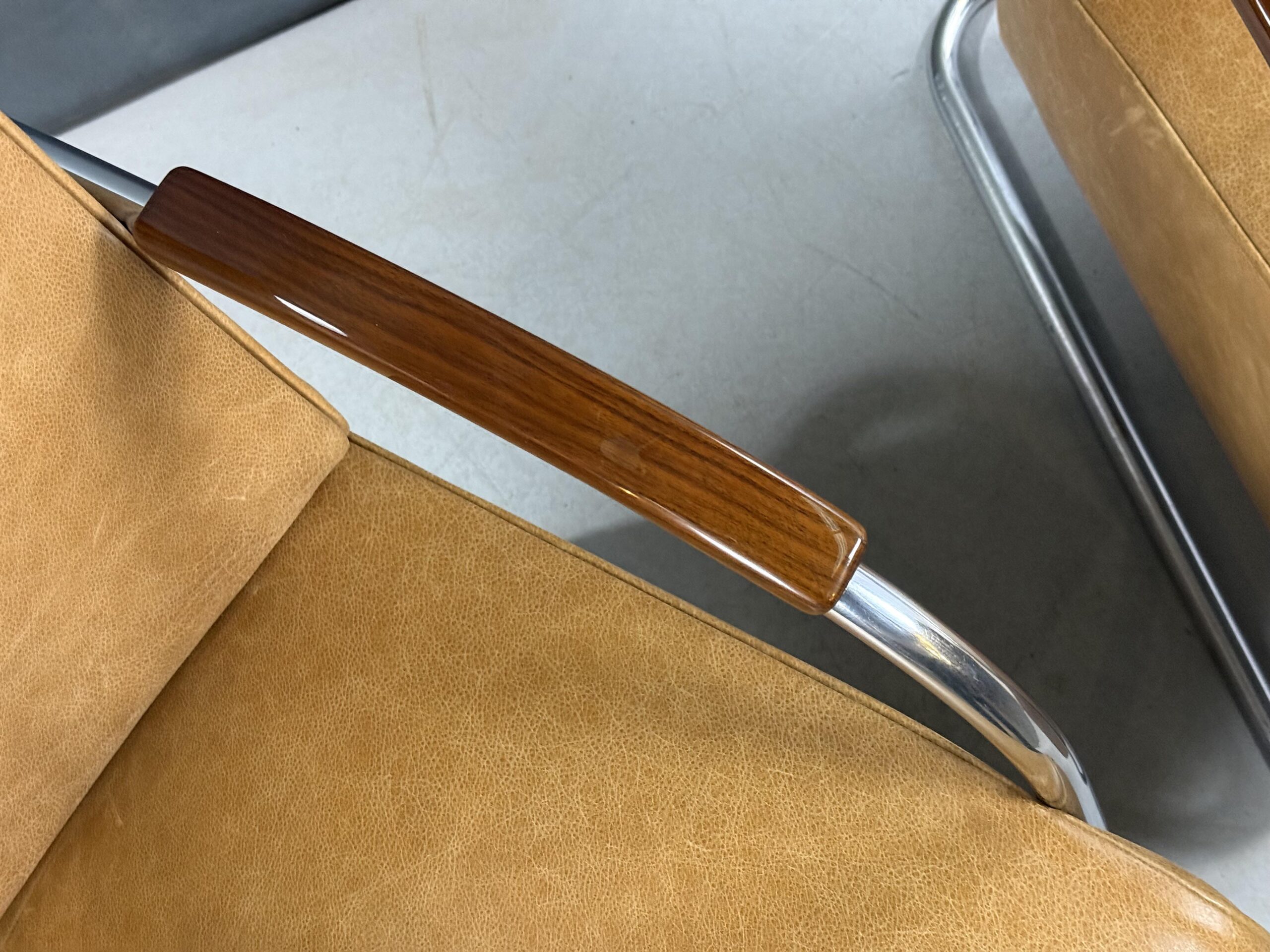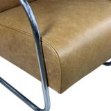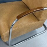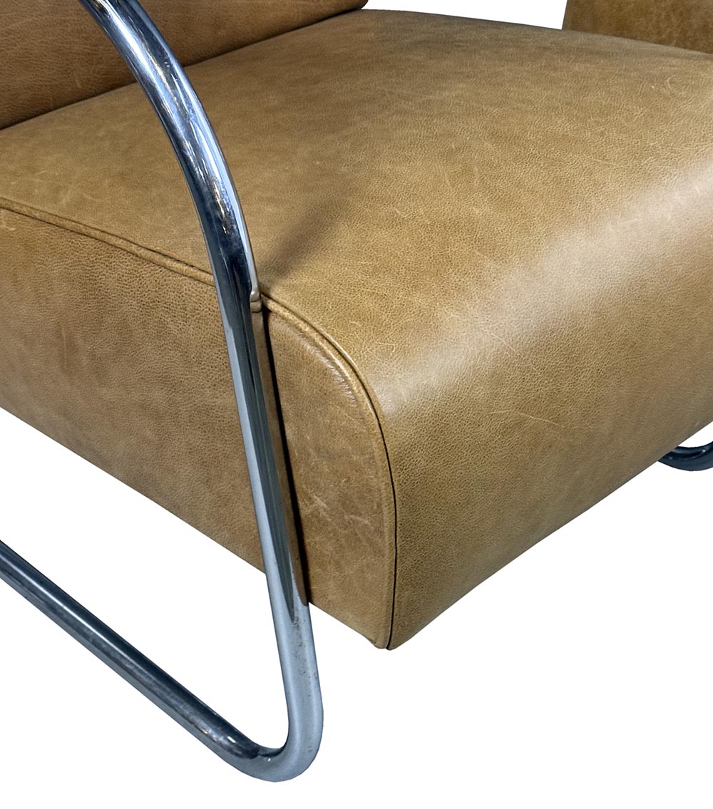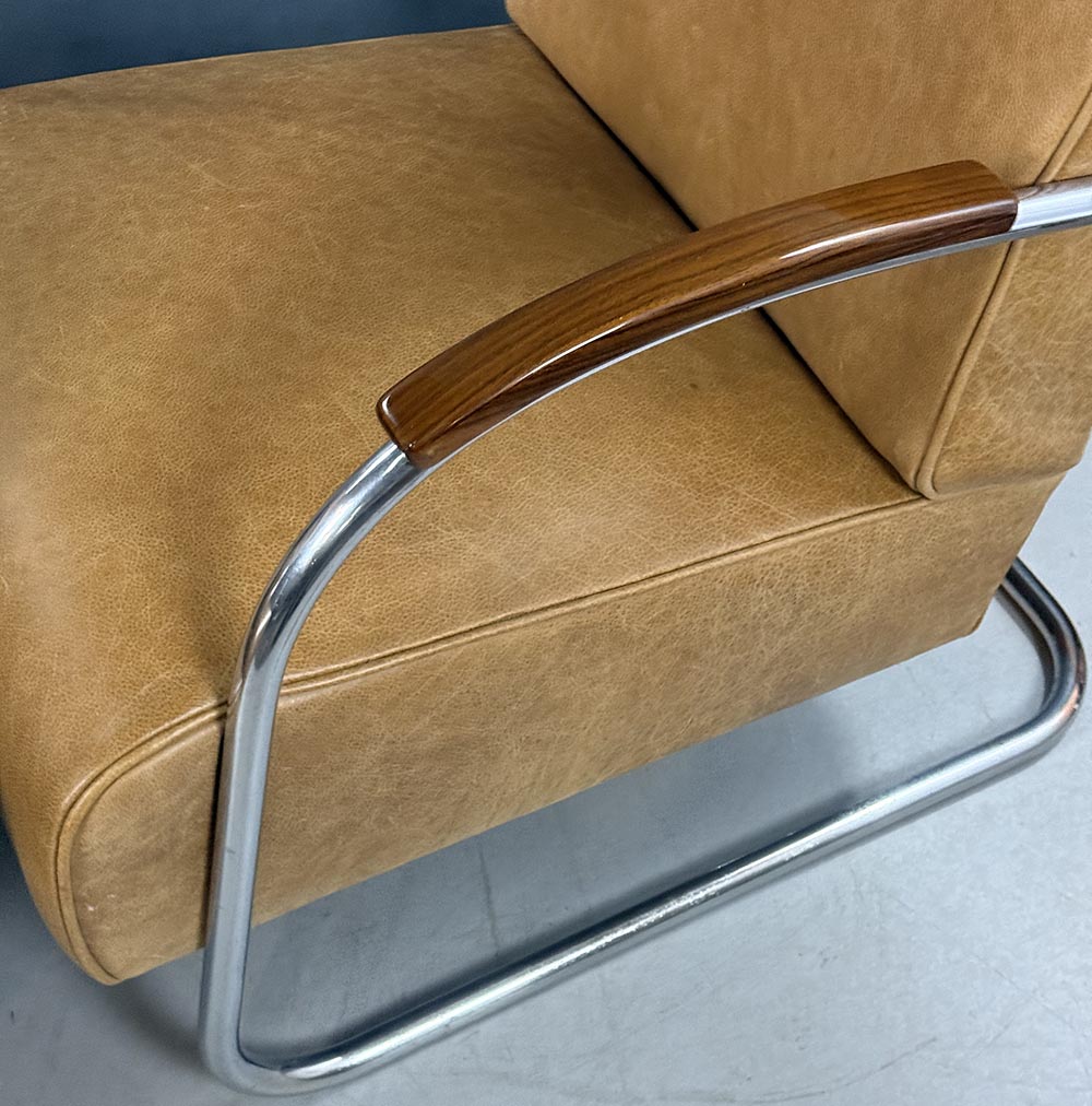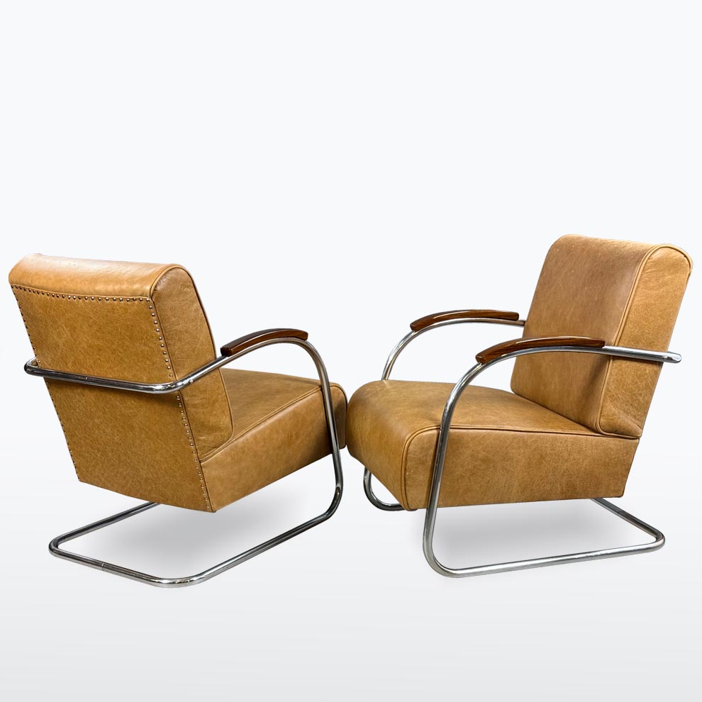 Pár funkcionalistických křesel představuje ikonický design trubkového nábytku meziválečného období. Křesla prošla odborným restaurováním s důrazem na zachování původního charakteru i vysoký estetický standard. Nové čalounění s kompletně obnovenou výplní podtrhuje čisté linie a komfort sezení, zatímco dřevěné područky byly citlivě restaurovány a opatřeny lakem ve vysokém lesku. Chromovaná trubková konstrukce zůstává původní a nese přirozenou patinu doby.