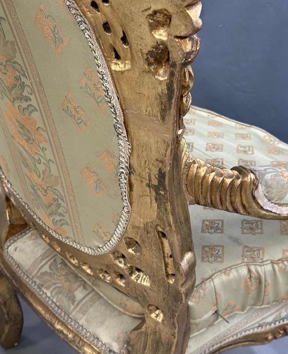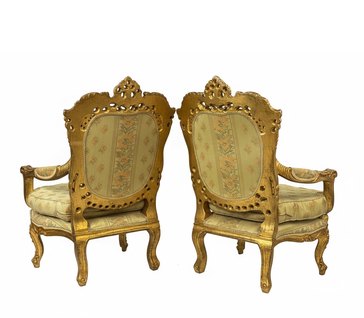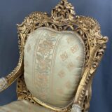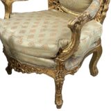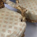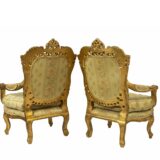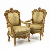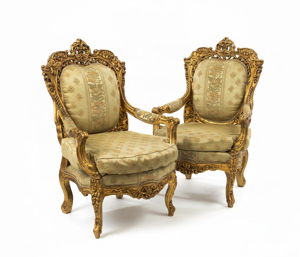 Reprezentativní pár bohatě řezbovaných křesel v původním stavu. Zlacené dřevěné konstrukce s bohatým dekorem doplňuje originální čalounění s jemným vzorem.
