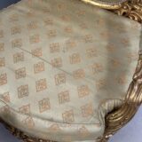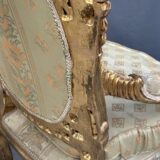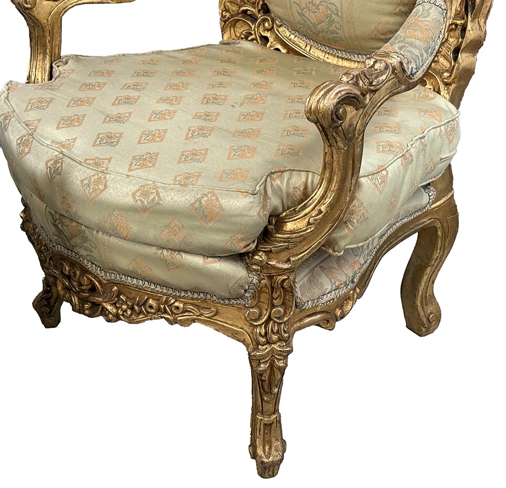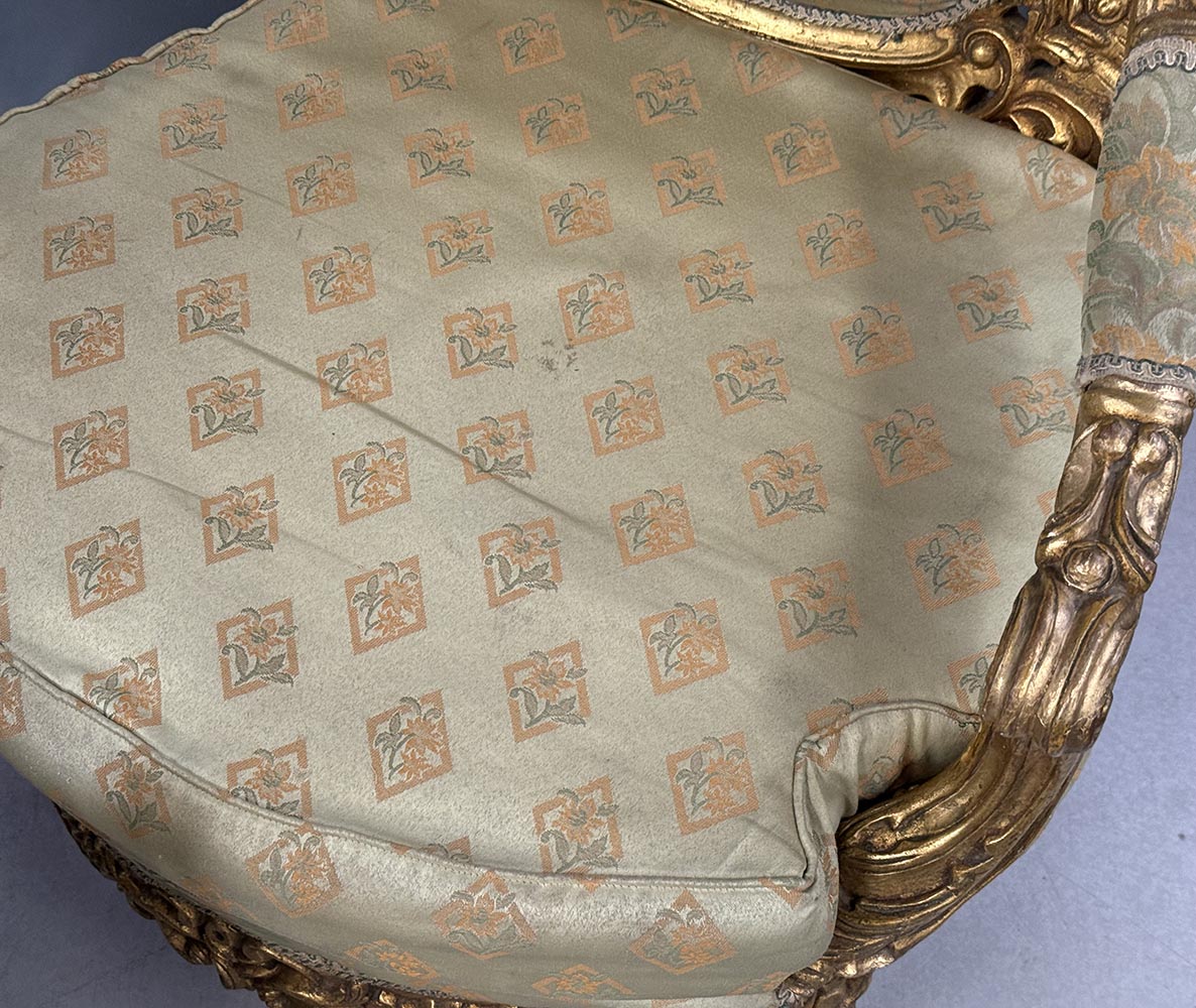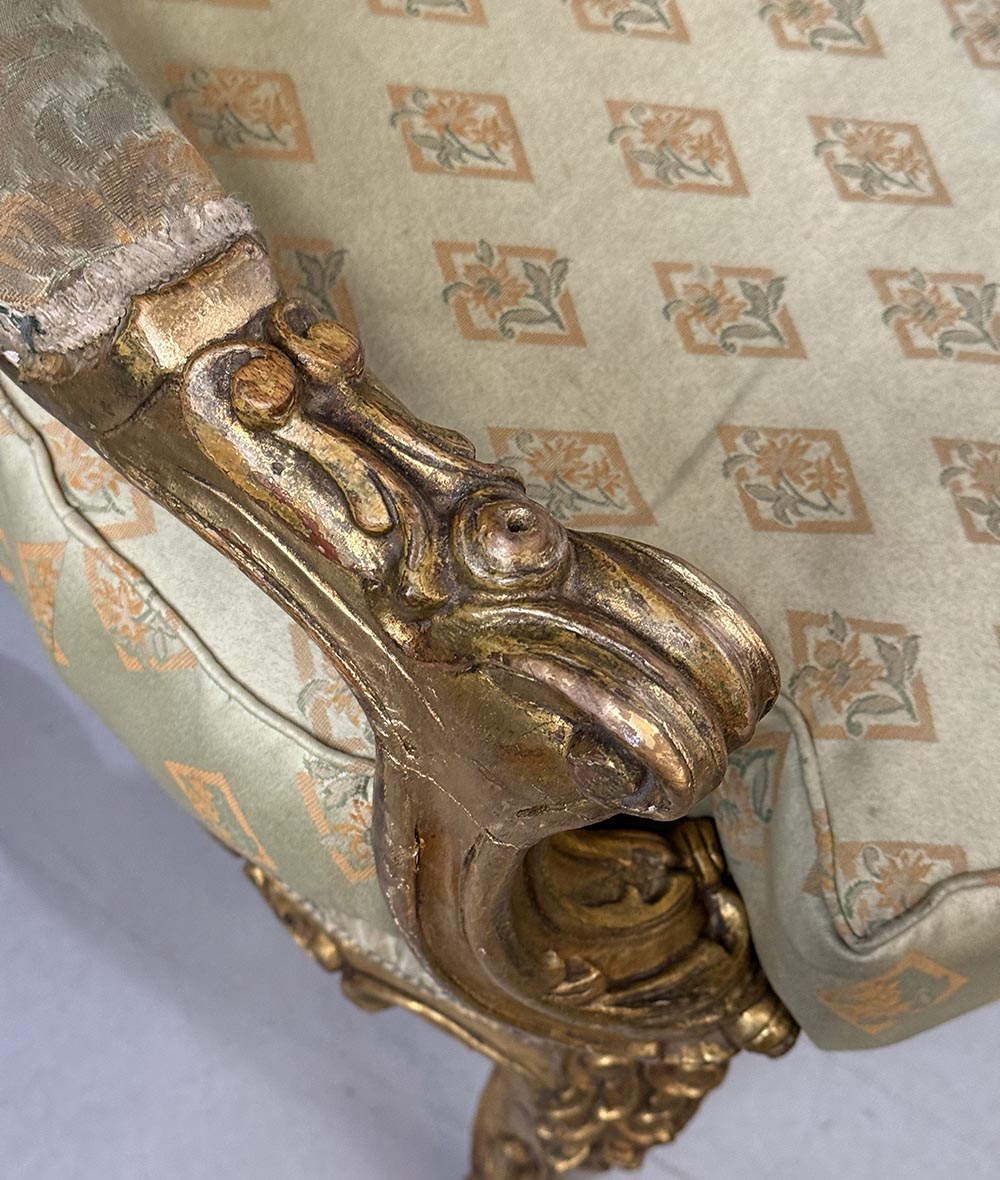 Reprezentativní pár bohatě řezbovaných křesel v původním stavu. Zlacené dřevěné konstrukce s bohatým dekorem doplňuje originální čalounění s jemným vzorem.