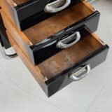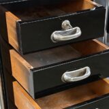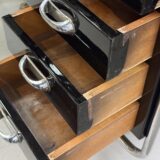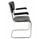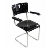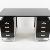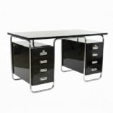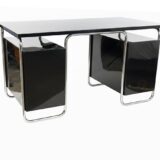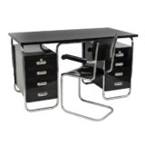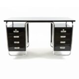 Funkcionalistický psací stůl s typickou chromovou trubkovou konstrukcí a úložnými bloky po stranách, doplněný původním křesílkem. Chromová konstrukce je původní, pouze odborně vyčištěná a vyleštěná. Dřevěné části byly profesionálně restaurovány do vysokého lesku. Celek působí čistě, reprezentativně a plně odpovídá dobové estetice.