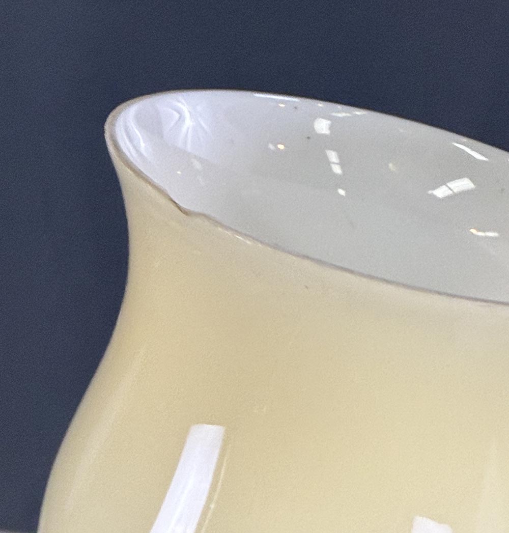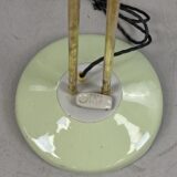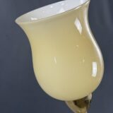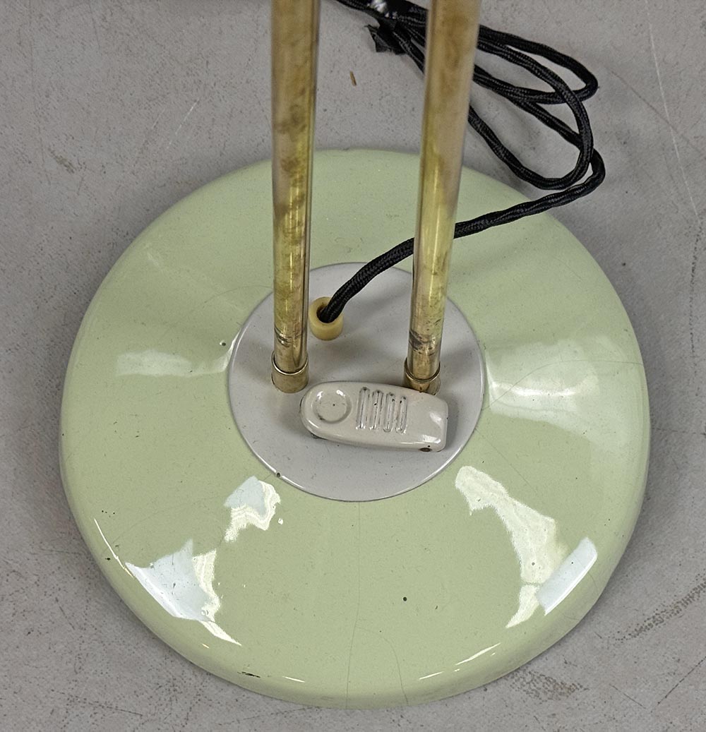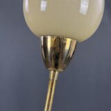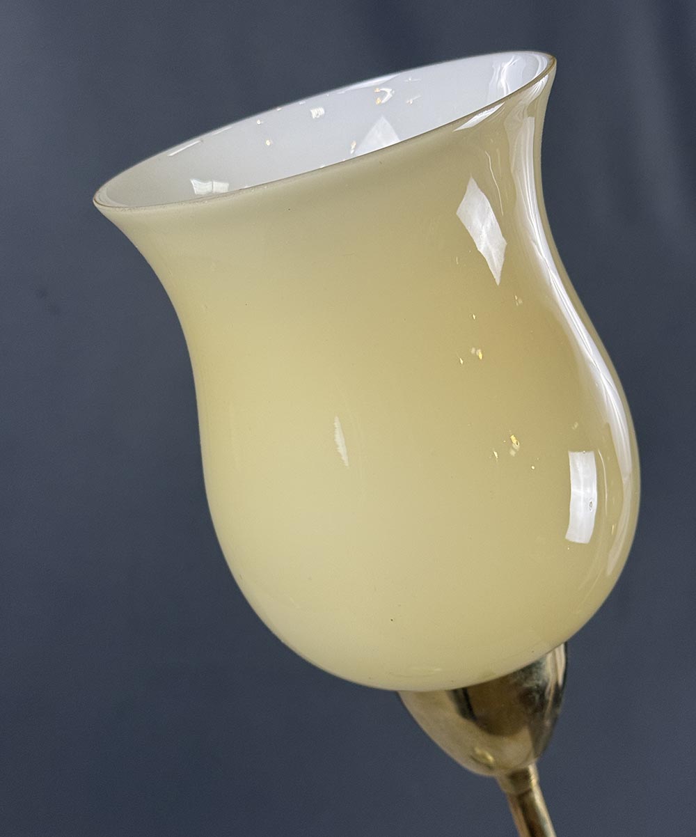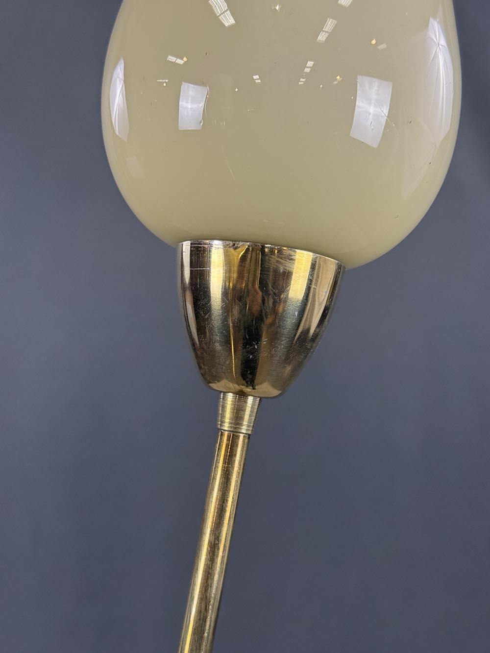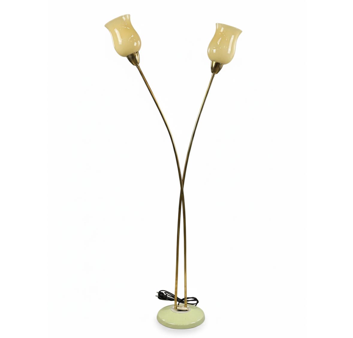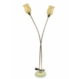 Stojací lampa s dvojicí štíhlých ramen a skleněnými stínidly, typická lehkou a vyváženou siluetou. Nová elektroinstalace, kovové části vyčištěny. Jedno stínidlo s drobným tukancem odpovídajícím stáří předmětu.