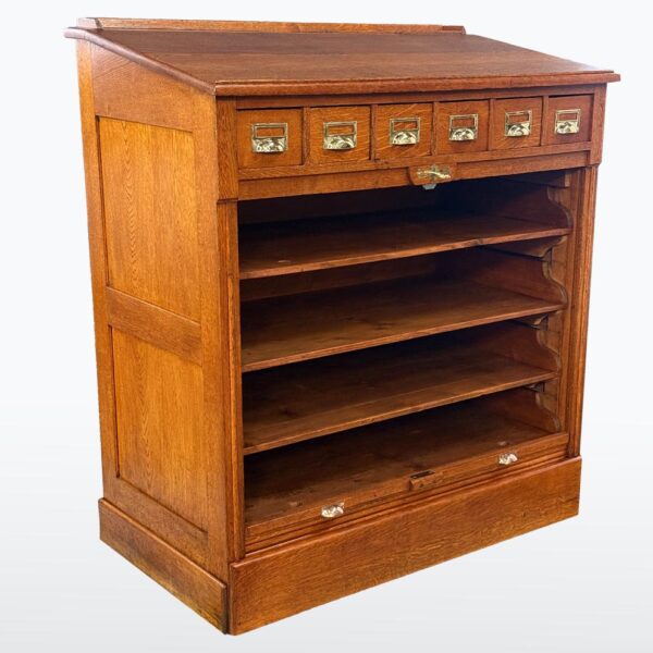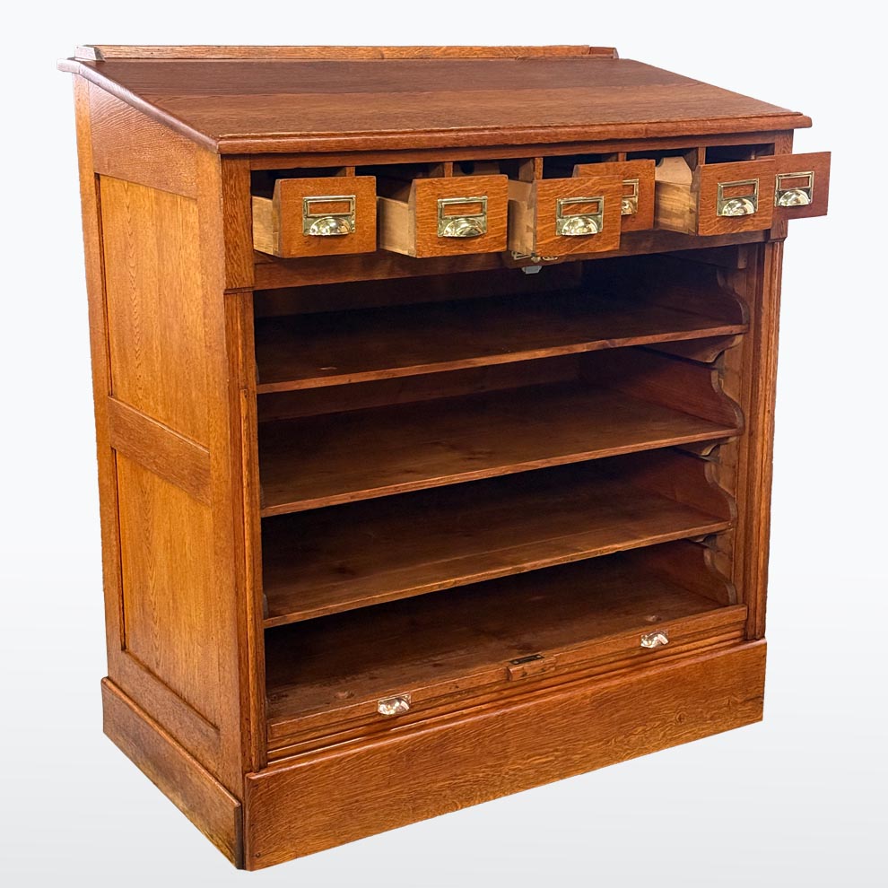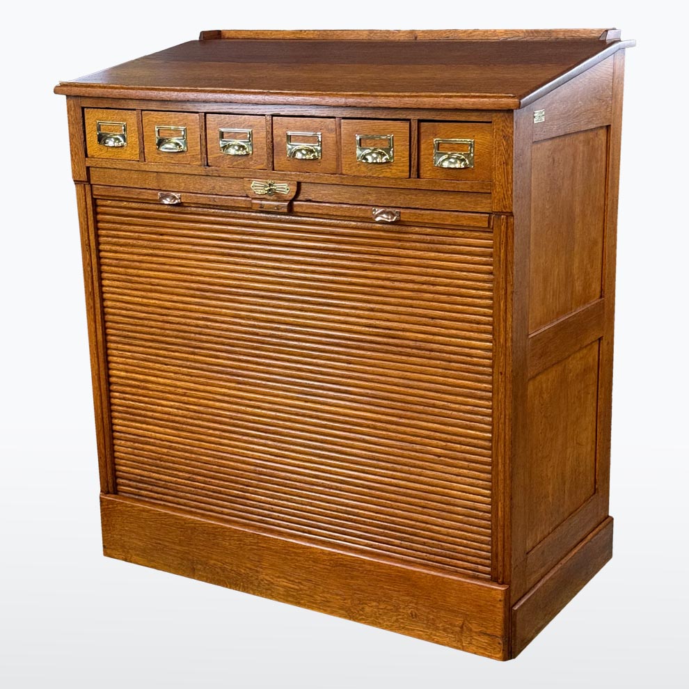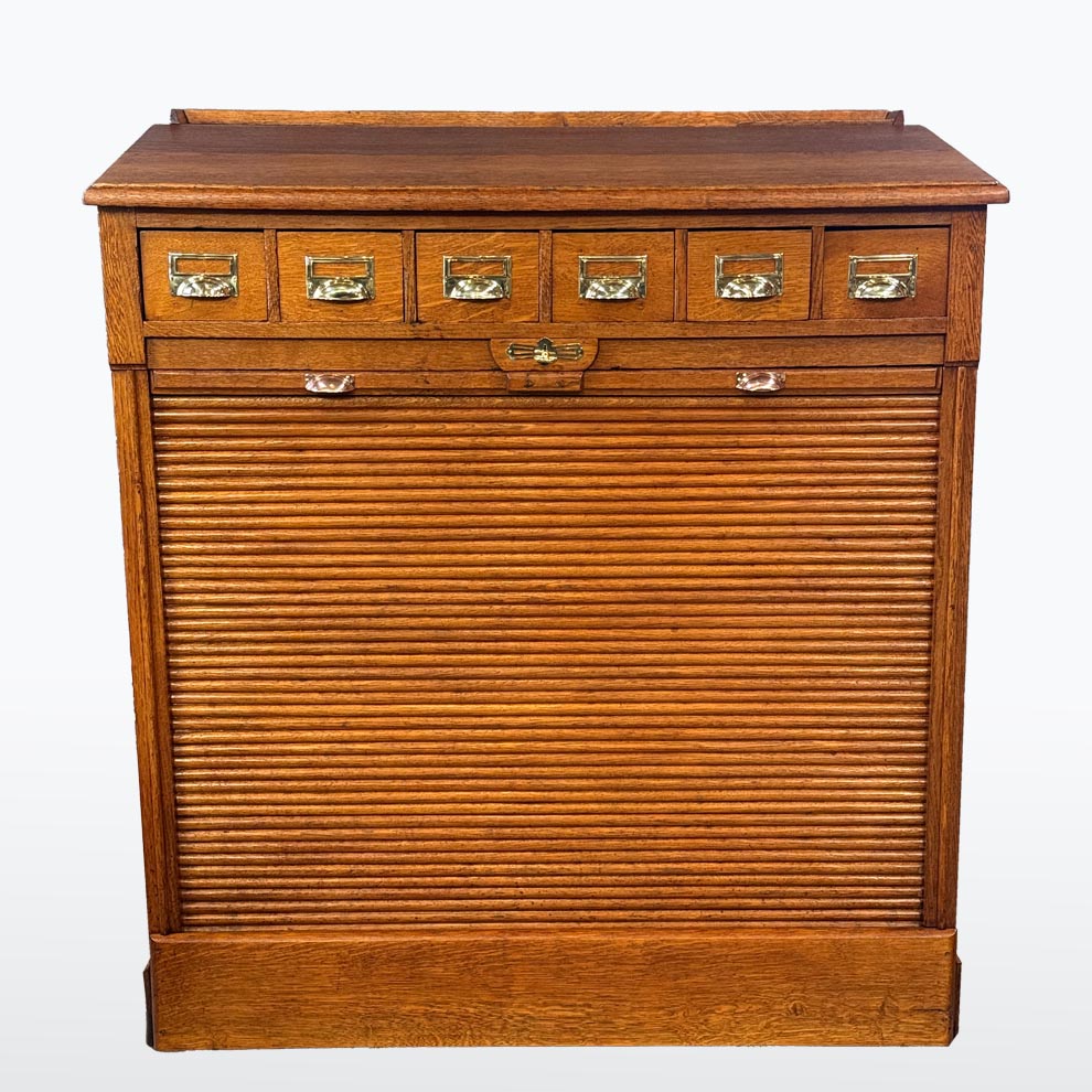 Tento roletový registr pochází z počátku 20. let 20. století a představuje typický kancelářský nábytek své doby – praktický, robustní a esteticky disciplinovaný. Horní část doplňuje řada malých zásuvek s mosaznými štítky, zatímco hlavní úložný prostor tvoří několik širokých výsuvných polic a původní roletová clona, která se plynule zasouvá do korpusu.