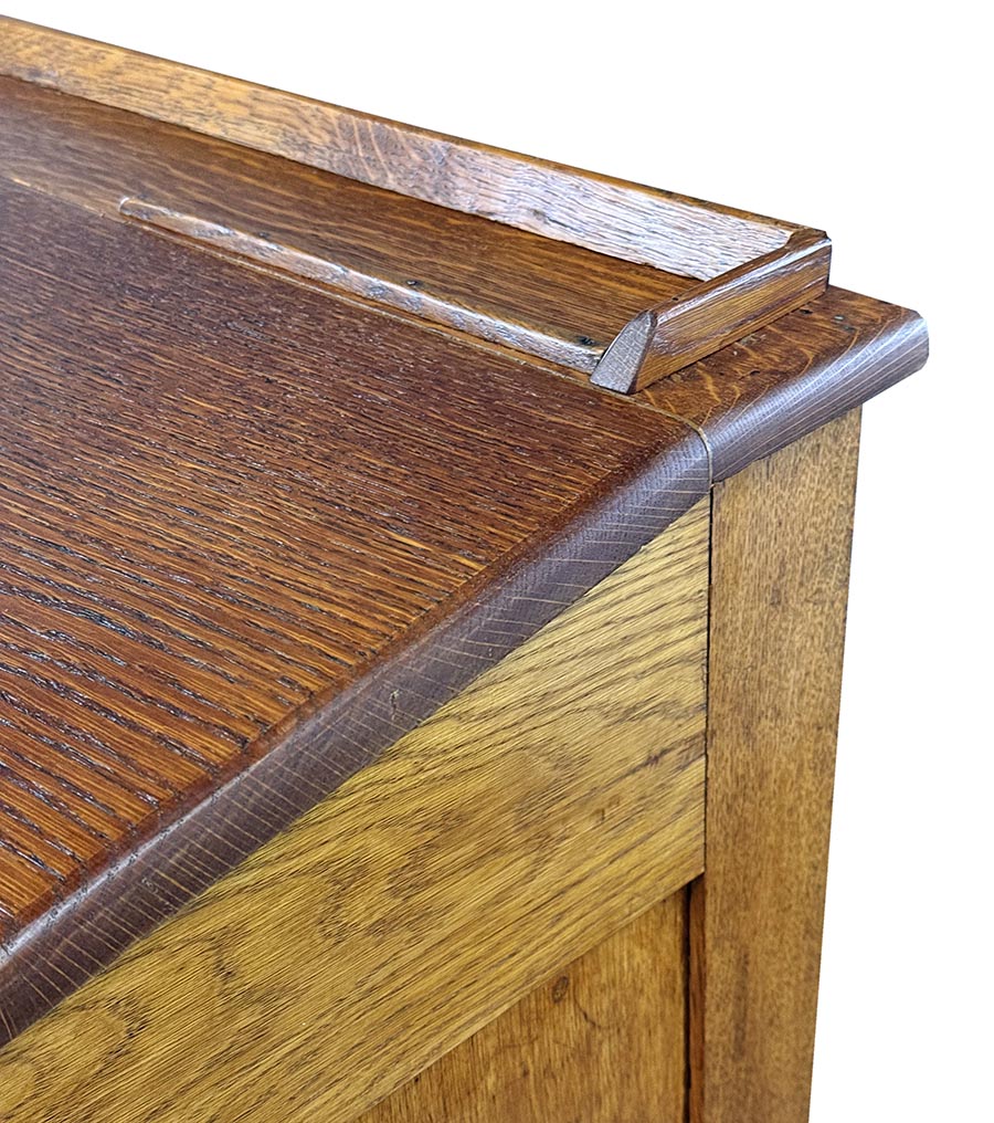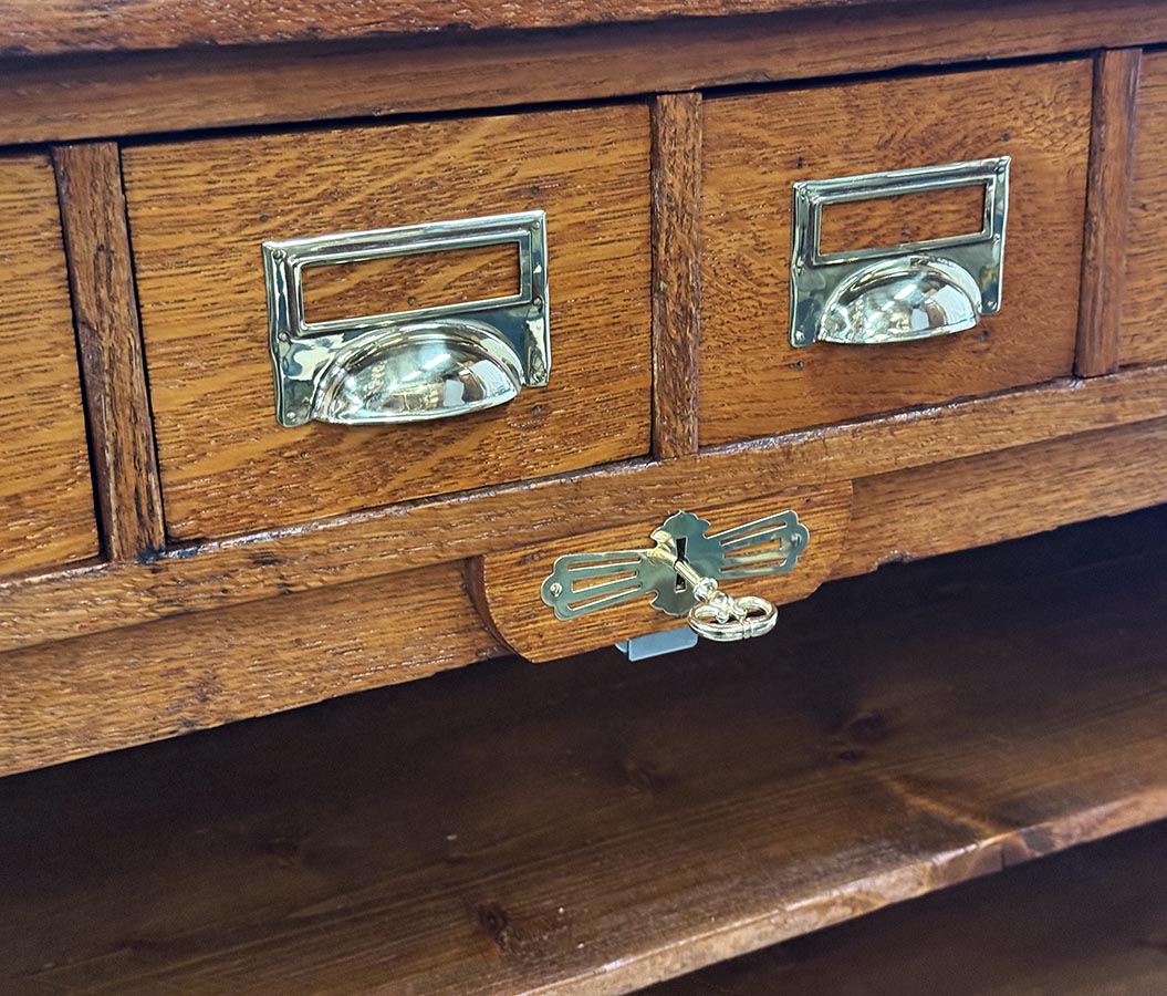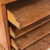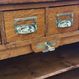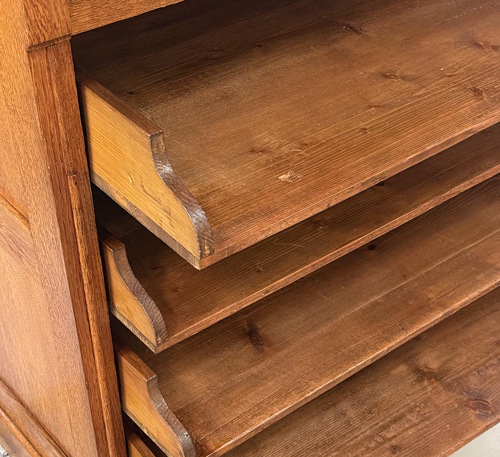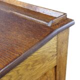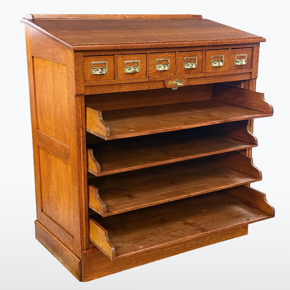 Tento roletový registr pochází z počátku 20. let 20. století a představuje typický kancelářský nábytek své doby – praktický, robustní a esteticky disciplinovaný. Horní část doplňuje řada malých zásuvek s mosaznými štítky, zatímco hlavní úložný prostor tvoří několik širokých výsuvných polic a původní roletová clona, která se plynule zasouvá do korpusu.