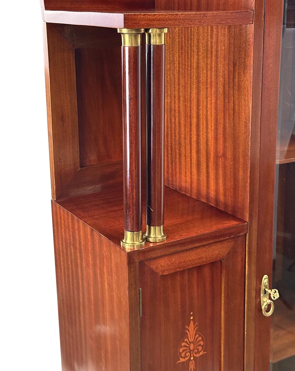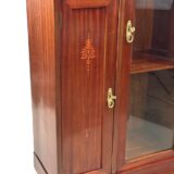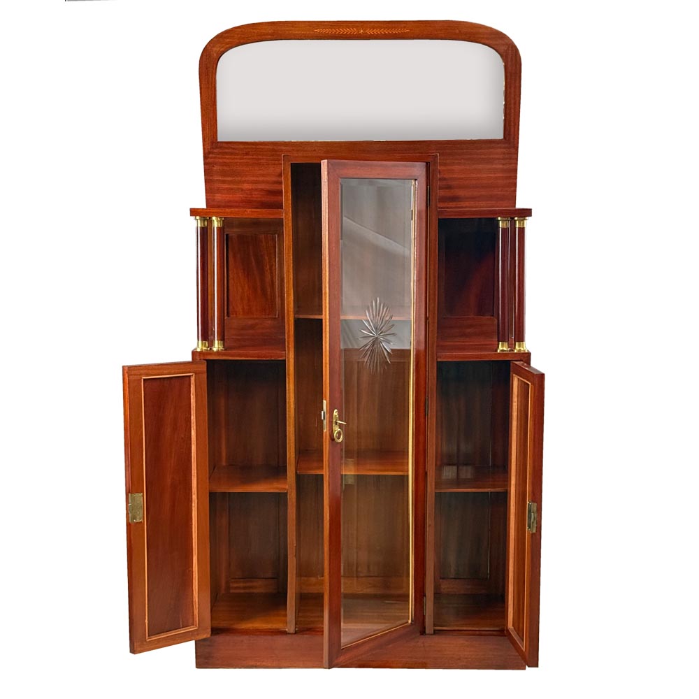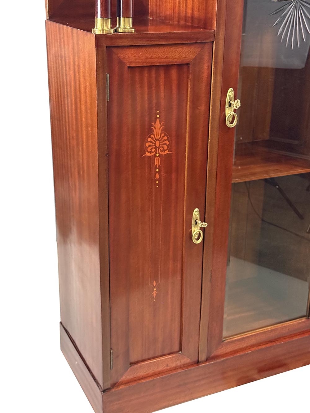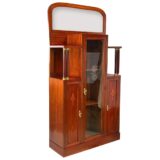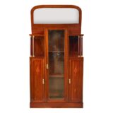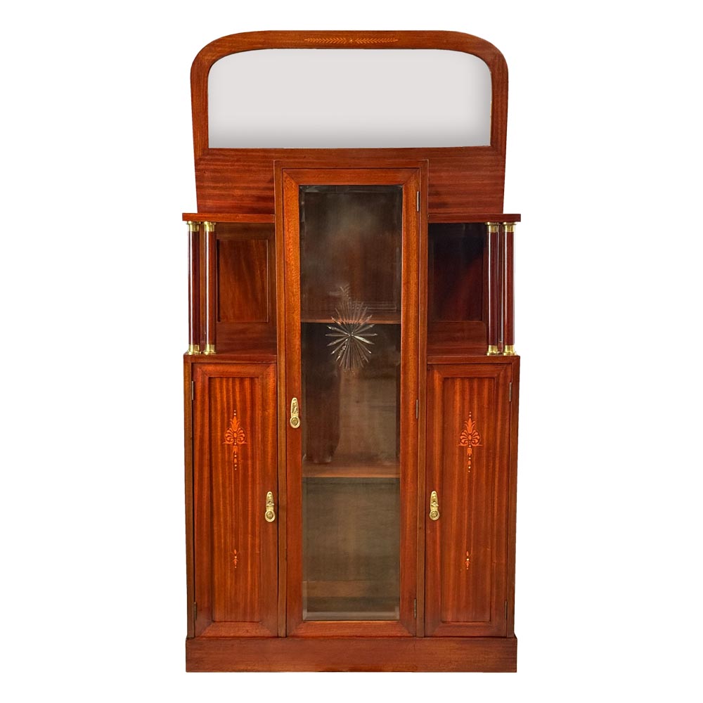 Secesní vitrína s typickými proporcemi a jemnými dekorativními detaily. Mahagonová dýha s výraznou kresbou, prosklená středová část a boční uzavíratelné skříňky doplněné mosazným kováním. Vhodná jako reprezentativní solitér do klasického i moderního interiéru.