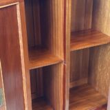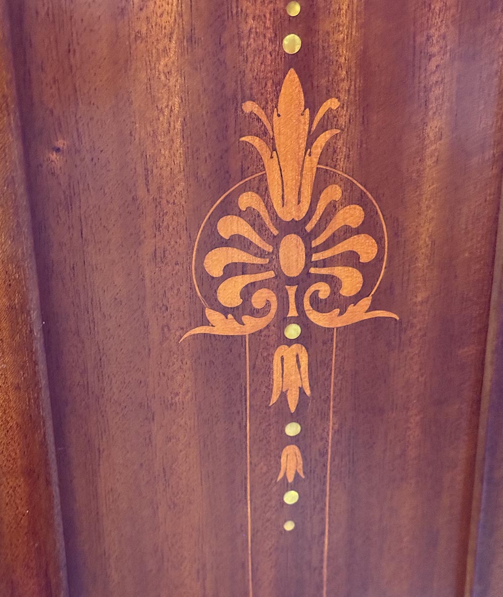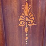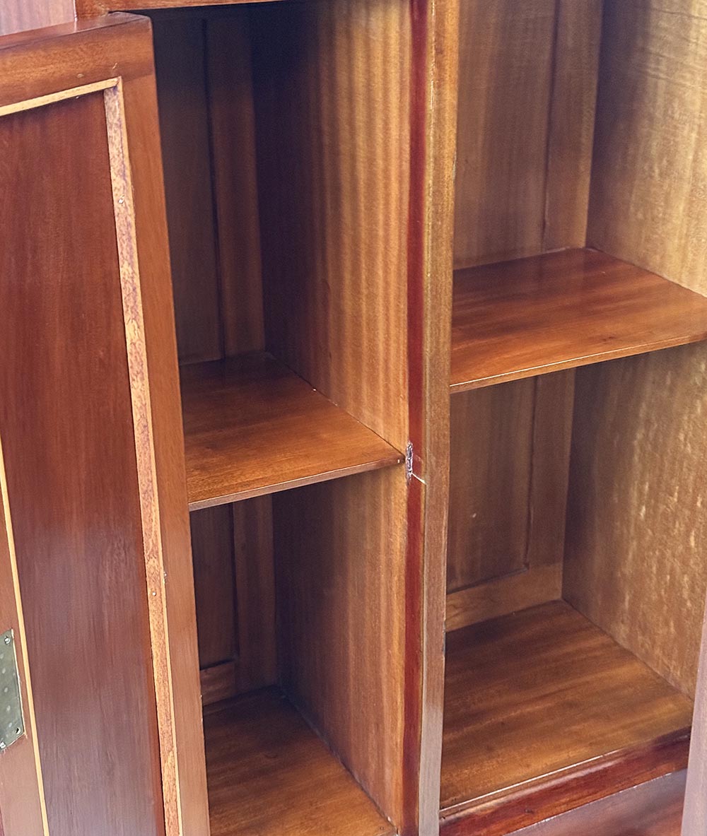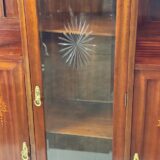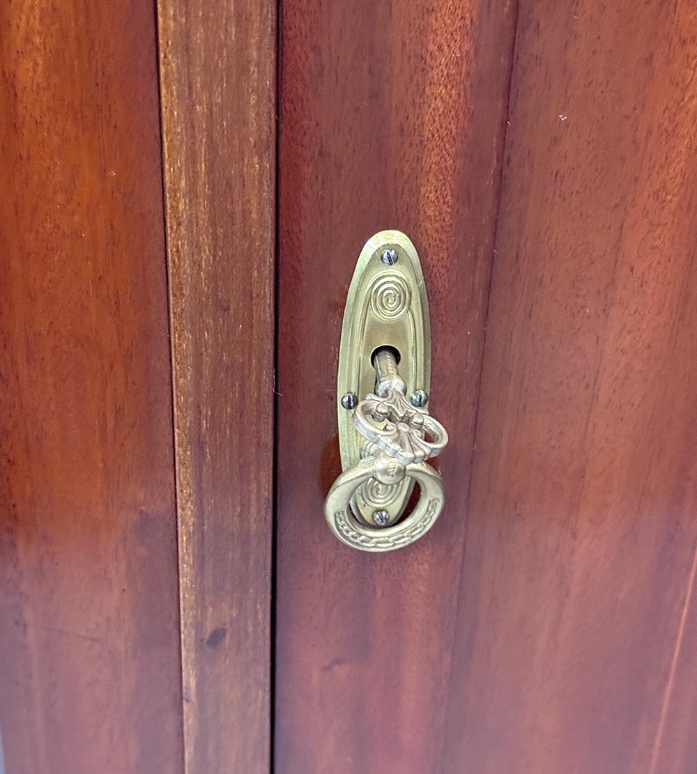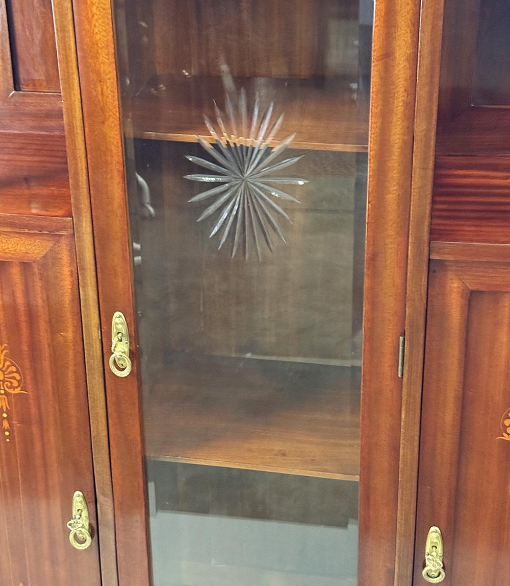 Secesní vitrína s typickými proporcemi a jemnými dekorativními detaily. Mahagonová dýha s výraznou kresbou, prosklená středová část a boční uzavíratelné skříňky doplněné mosazným kováním. Vhodná jako reprezentativní solitér do klasického i moderního interiéru.