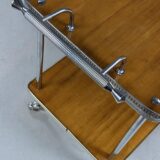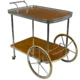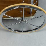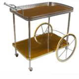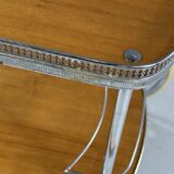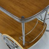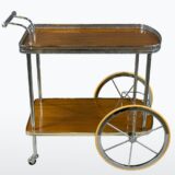 Servírovací stolek ve stylu Maison Jansen ze 60. let 20. století vyniká kombinací teplých dřevěných desek a dekorativních chromovaných prvků. Typickým prvkem jsou velká paprsková kola s dřevěným lemem, díky nimž působí stolek nejen prakticky, ale i výrazně esteticky. Horní deska je doplněna ozdobnou chromovanou lištou, spodní úroveň nabízí dostatek prostoru pro lahve či sklenice. Celek působí luxusně a lehce, přesně v duchu francouzské elegance Maison Jansen.
