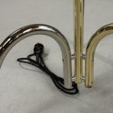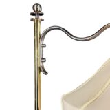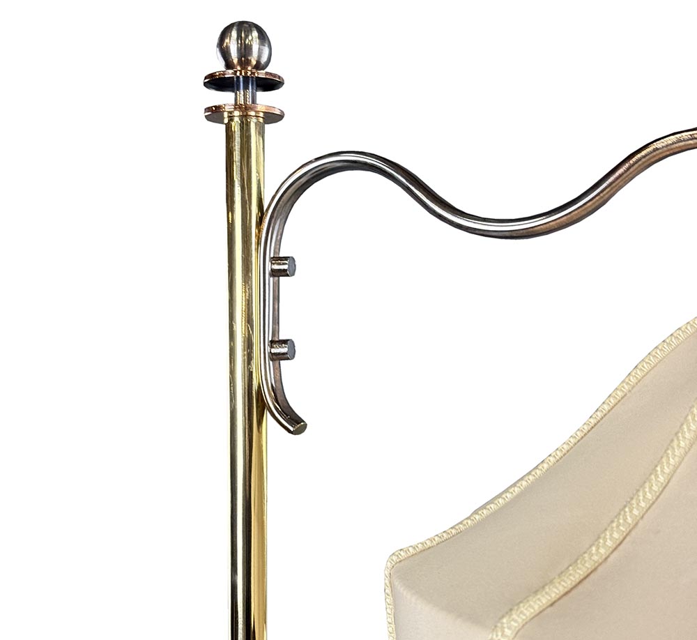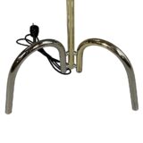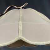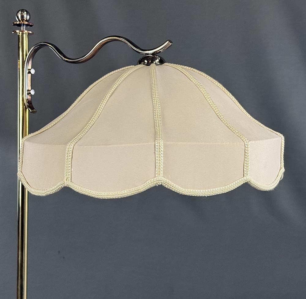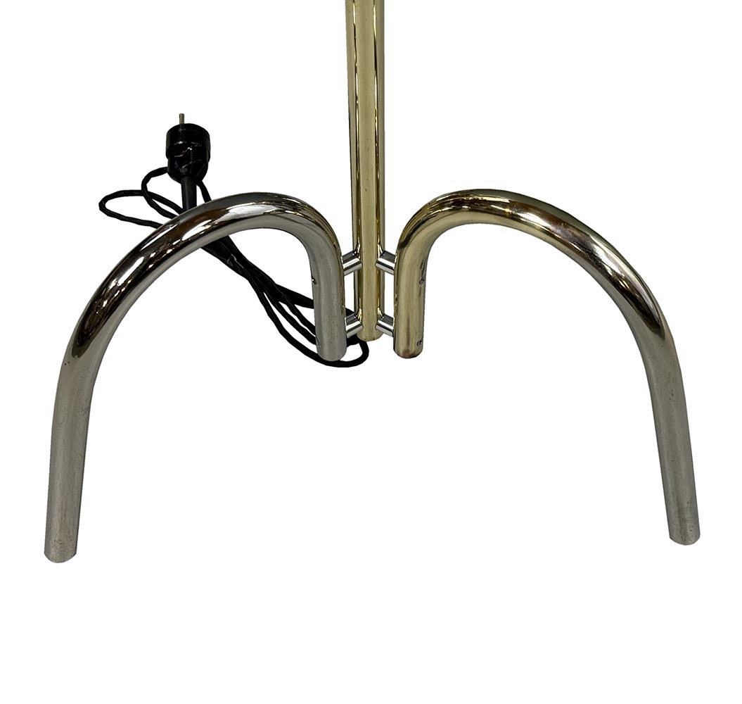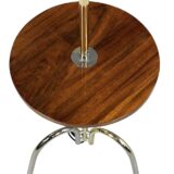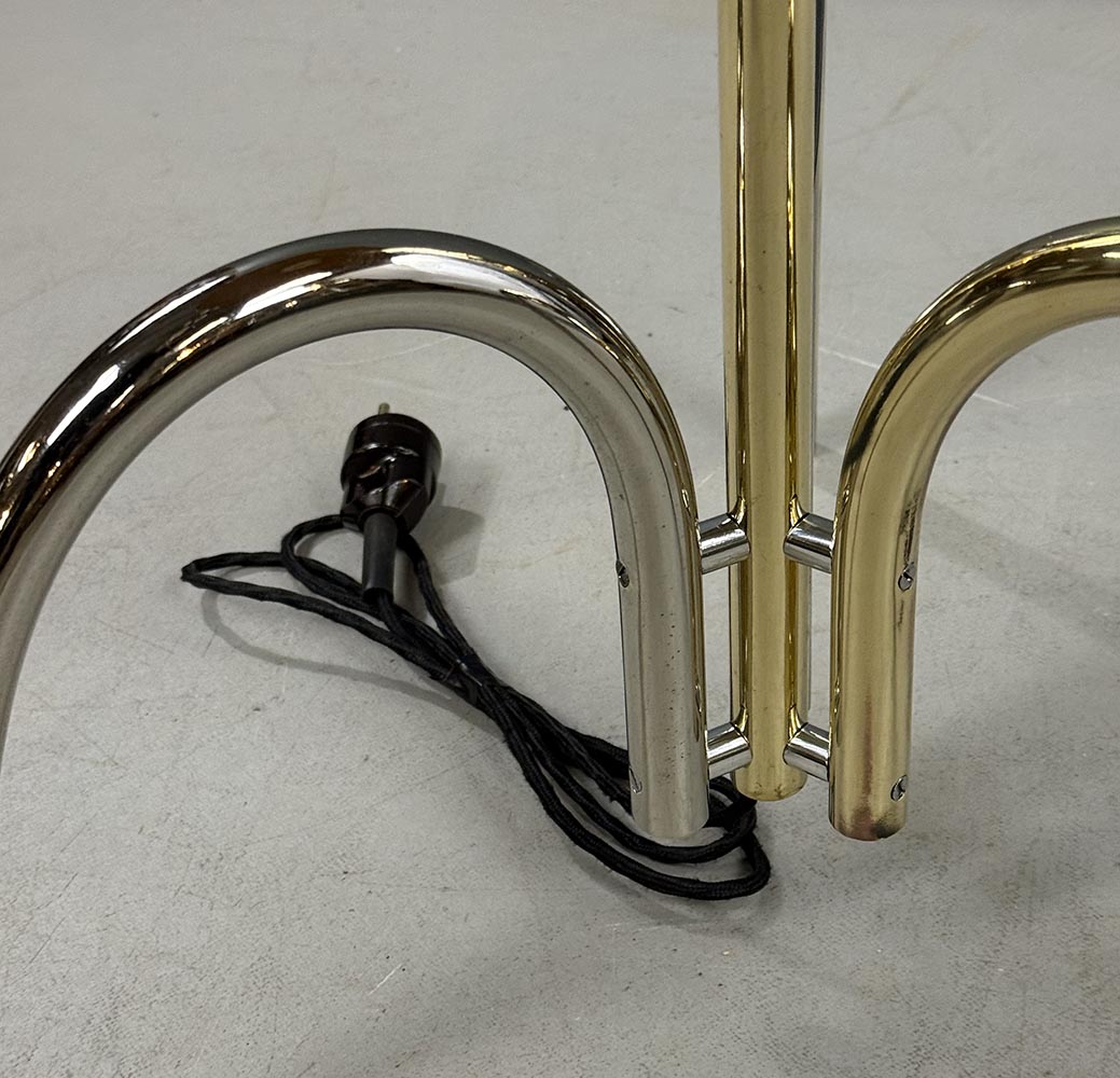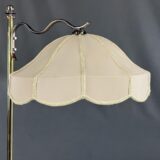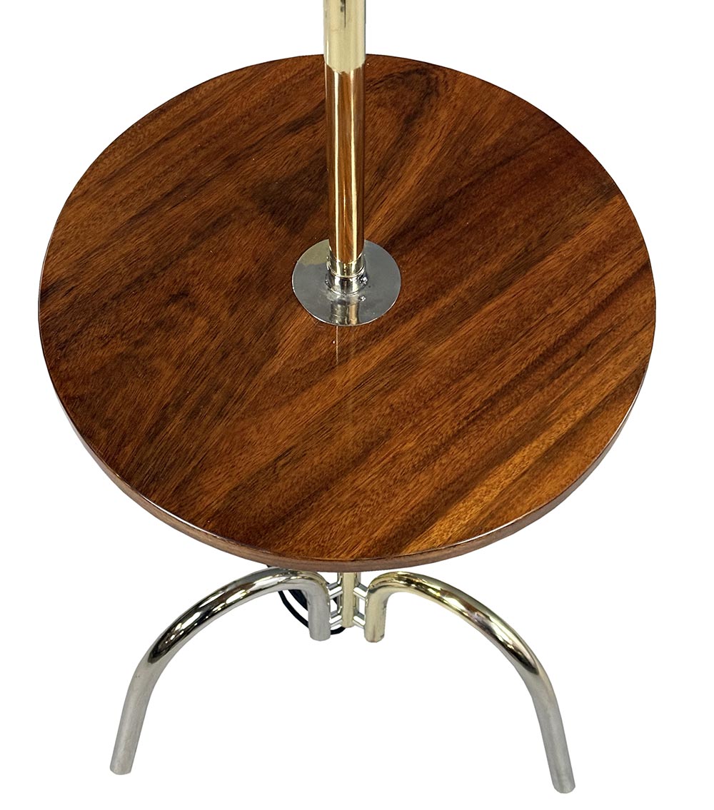 Stojací lampa ve stylu Art Deco s elegantní kovovou konstrukcí a praktickým odkládacím stolkem z ořechové dýhy. Konstrukce byla odborně vyčištěna a vyleštěna, čímž vyniká její jemná linie. Nově zhotovený látkový širm je světelně propustný a vytváří příjemné, měkké osvětlení. Ořechová deska odborně restaurována.