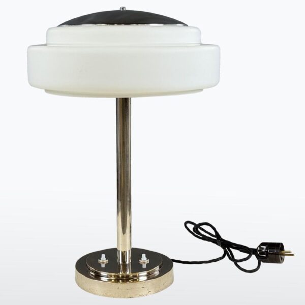 Stolní lampa ve stylu Art Deco s typickým opálovým skleněným stínidlem a chromovanou konstrukcí. Čisté geometrické tvary a kombinace kovu se sklem odpovídají estetice 30. let 20. století. Lampa prošla odborným servisem, má novou elektroinstalaci a je plně funkční. Vhodná jako solitér na psací stůl, komodu nebo noční stolek, kde poskytne měkké, rozptýlené světlo.