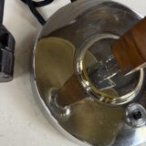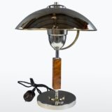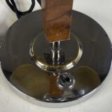 Stolní lampa z období Art Deco, která v sobě spojuje ušlechtilé materiály a typickou estetiku 30. let. Chromovaná konstrukce se zrcadlovým leskem je doplněna elegantním dřevěným segmentem ve střední části, jehož teplý odstín krásně kontrastuje s chladným kovem.