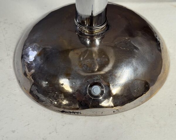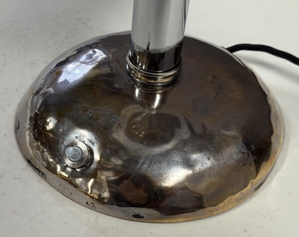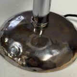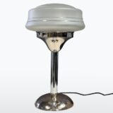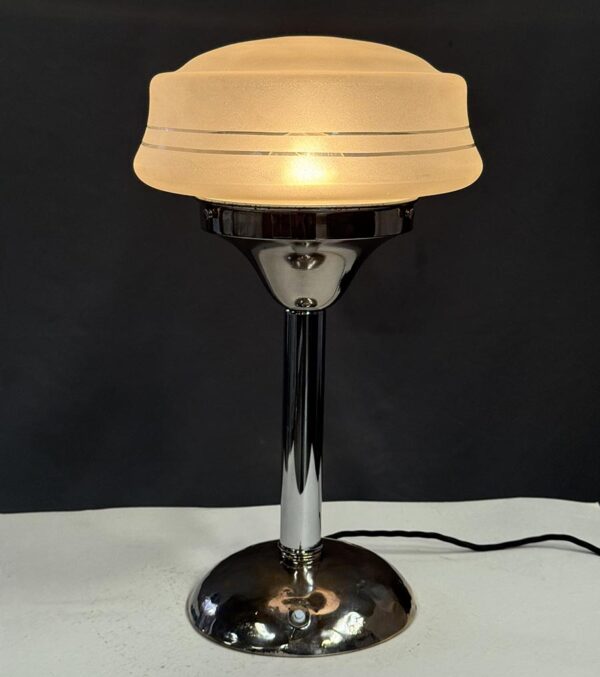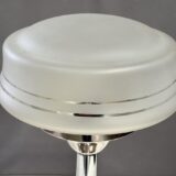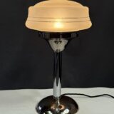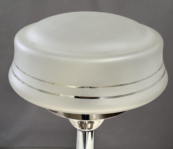 Stolní lampa z období Art-Deco s jednoduchou a přitom výraznou siluetou. Chromovaný dřík doplňuje původní kovový podstavec, který byl značně poškozen, ale byl odborně zachráněn a stabilizován tak, aby si lampa uchovala svůj autentický charakter. Stínidlo z pískovaného skla s linkami dodává jemné a rozptýlené světlo, ideální pro atmosférické osvětlení interiéru. Tento kus je skvělým příkladem nadčasového funkcionalistického designu, který vynikne jak v klasickém, tak moderním prostředí.