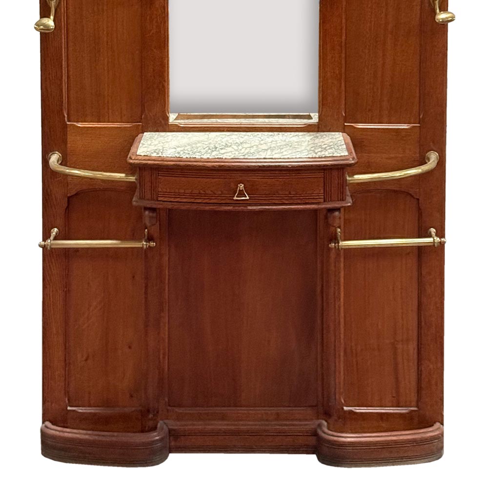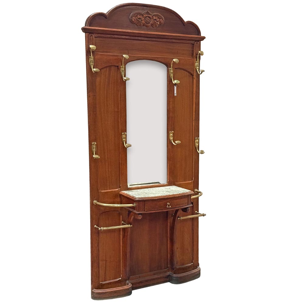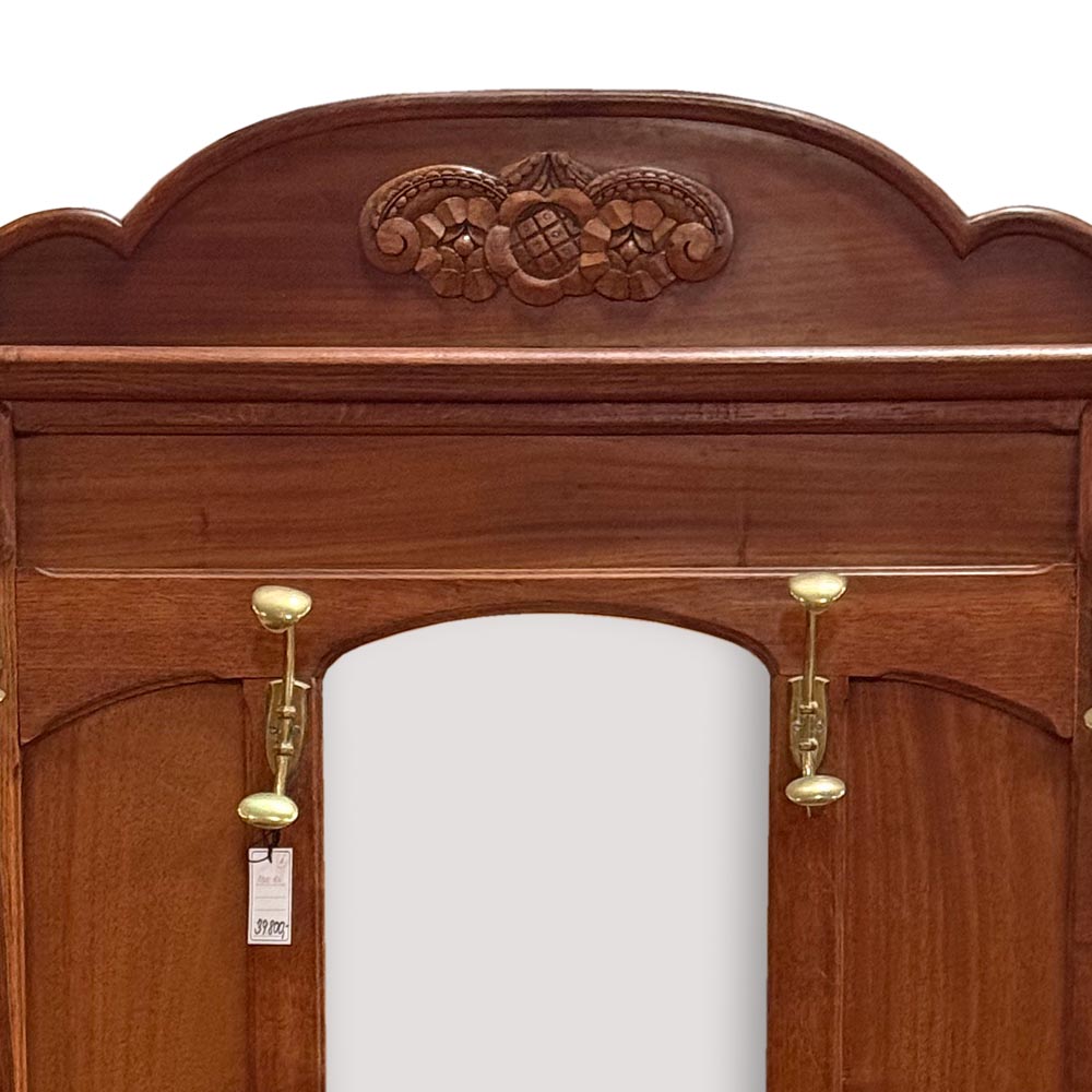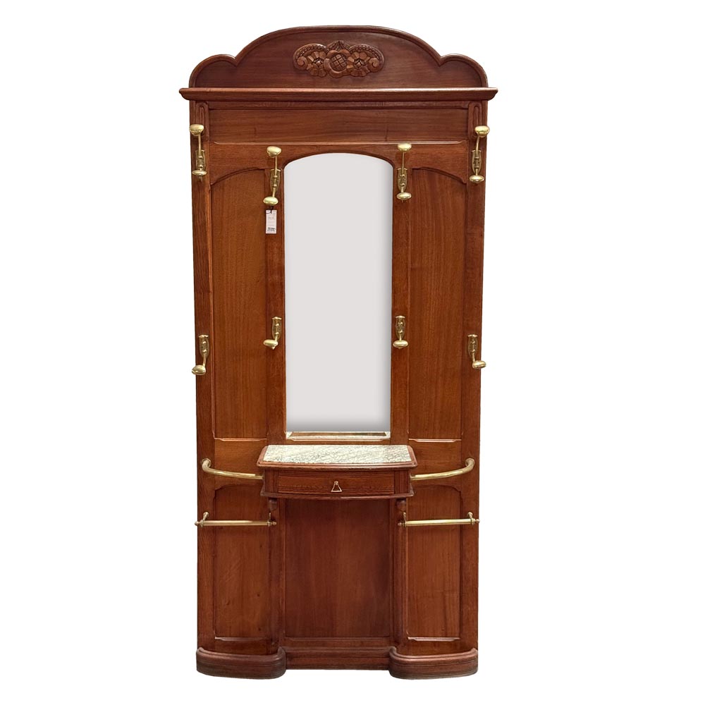 Secesní věšáková stěna z dubového dřeva. Dominantou je centrální fazetové zrcadlo zasazené do jemně tvarovaného rámu, doplněné horní římsou s vyřezávaným ornamentem. Funkčnost podtrhuje množství původních mosazných háčků a praktická odkládací plocha s mramorovou deskou a drobnou zásuvkou. Spodní část je doplněna držáky na deštníky.