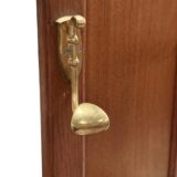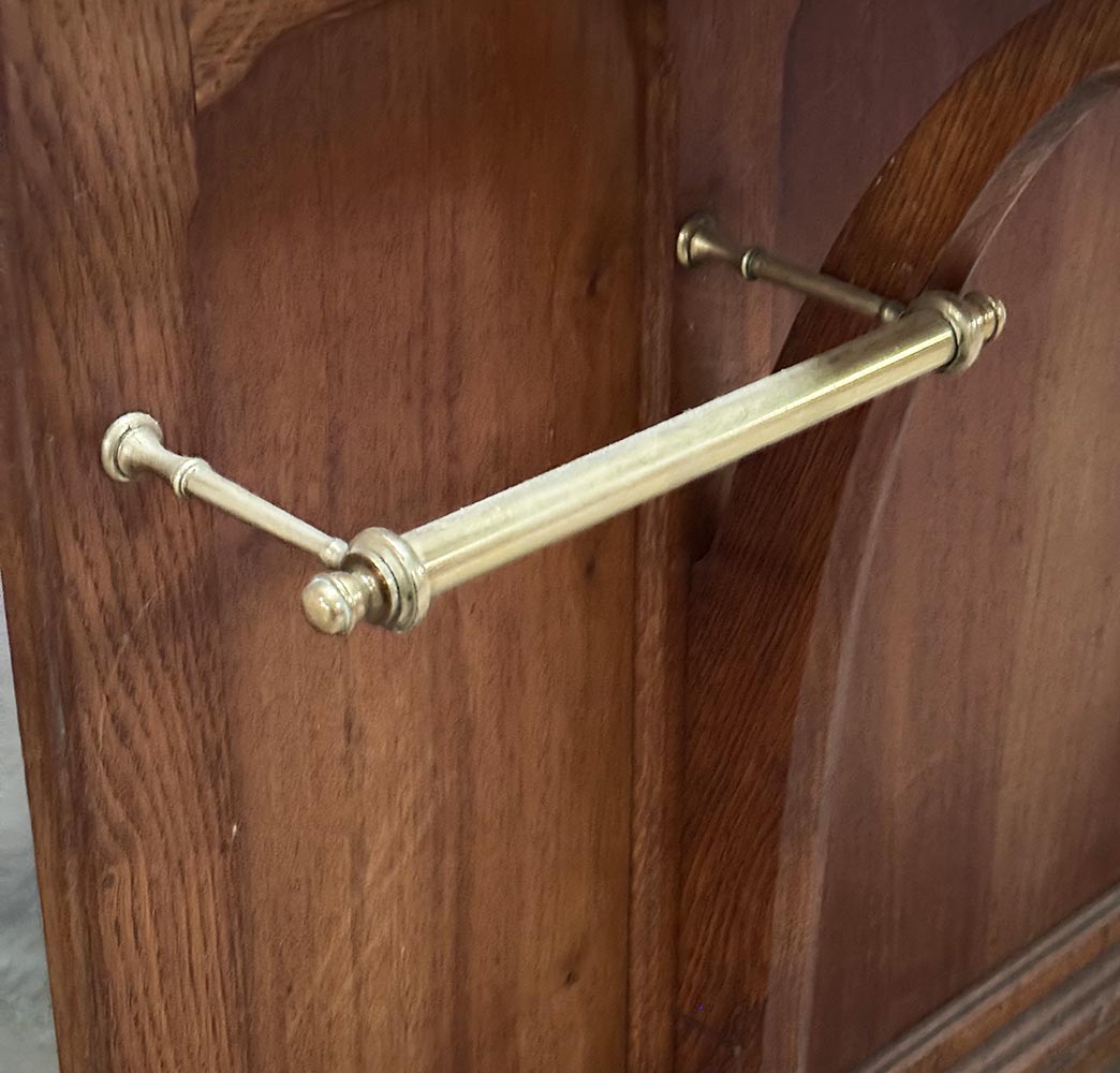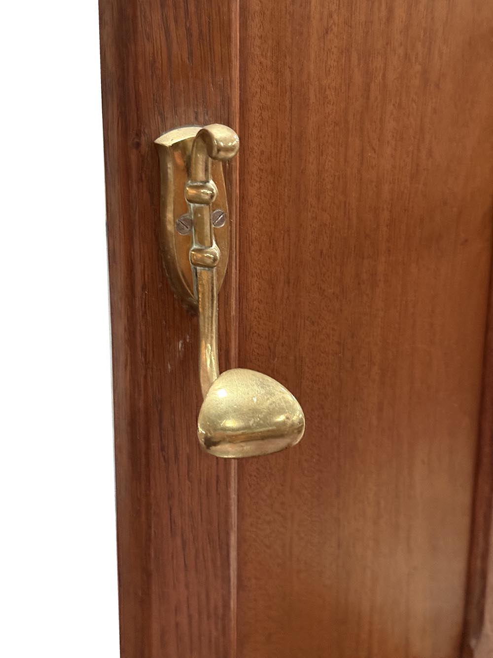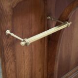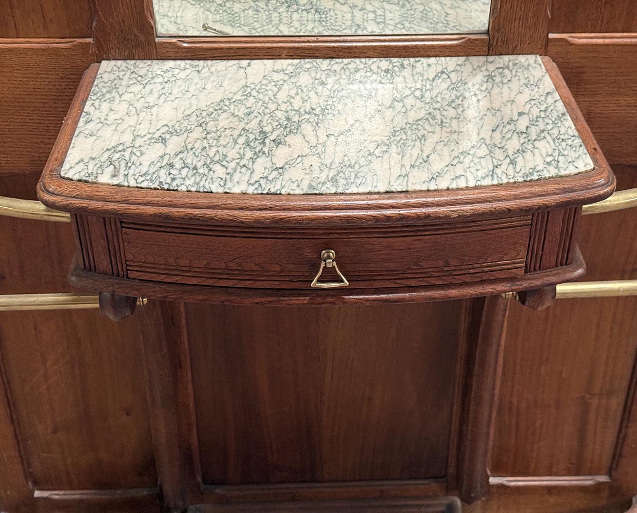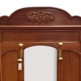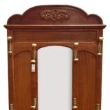 Secesní věšáková stěna z dubového dřeva. Dominantou je centrální fazetové zrcadlo zasazené do jemně tvarovaného rámu, doplněné horní římsou s vyřezávaným ornamentem. Funkčnost podtrhuje množství původních mosazných háčků a praktická odkládací plocha s mramorovou deskou a drobnou zásuvkou. Spodní část je doplněna držáky na deštníky.