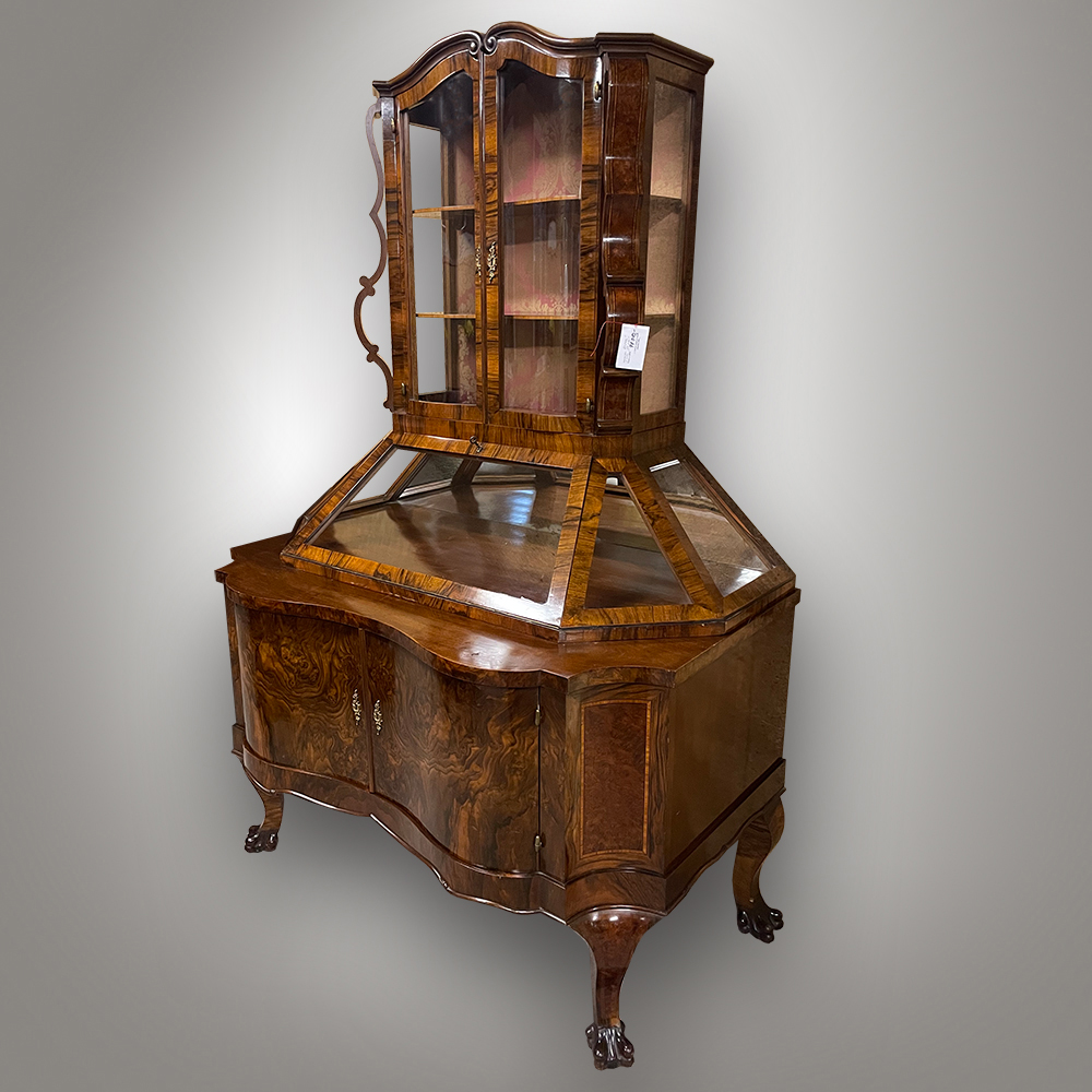 Materiál: ořech, sklo, zrcadlo, mosazné kování.