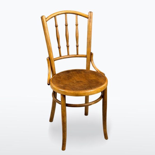 Židle Thonet z počátku 20. století s typickým ručně ohýbaným dřevem a kulatým sedákem. Model vyniká jednoduchým sedákem a štíhlým opěradlem s třemi soustruženými sloupky. Stabilní konstrukce, teplý odstín dřeva a originální patina z ní dělají atraktivní kus.